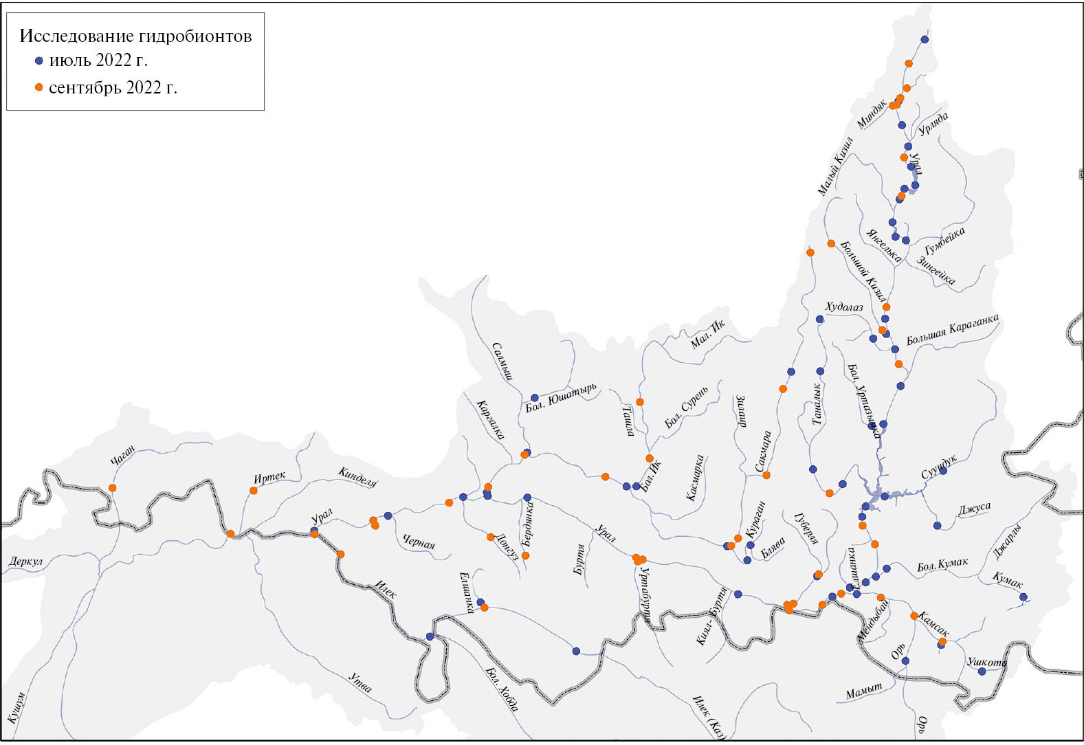 С целью установления наиболее полной пространственной гидробиологической и ихтиологической характеристики водных объектов бассейна р. Урал в 2022 г. были проведены две экспедиции. В июле и сентябре 2022 г. выполнены двухэтапные гидробиологические исследования на водных объектах российской части бассейна Урала. Всего в рамках полевых обследований 2022 г. (рис. 1) отобрано 116 проб воды на гидробиологические показатели: 58 проб в июле, 59 проб в сентябре.