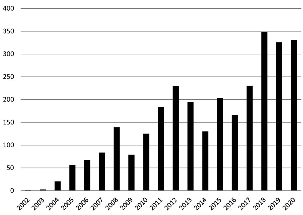 Источник: https://trendeconomy.ru/data/h2?commodity=2814&reporter=China&trade_flow=Import,Export&partner =World&indicator=TV&time_period=2002,2003,2004,2005,2006,2007,2008,2009,2010,2011,2012,2013,2014,2015,2016,2017,2018,2019,2020 (accessed 10.04.2022)