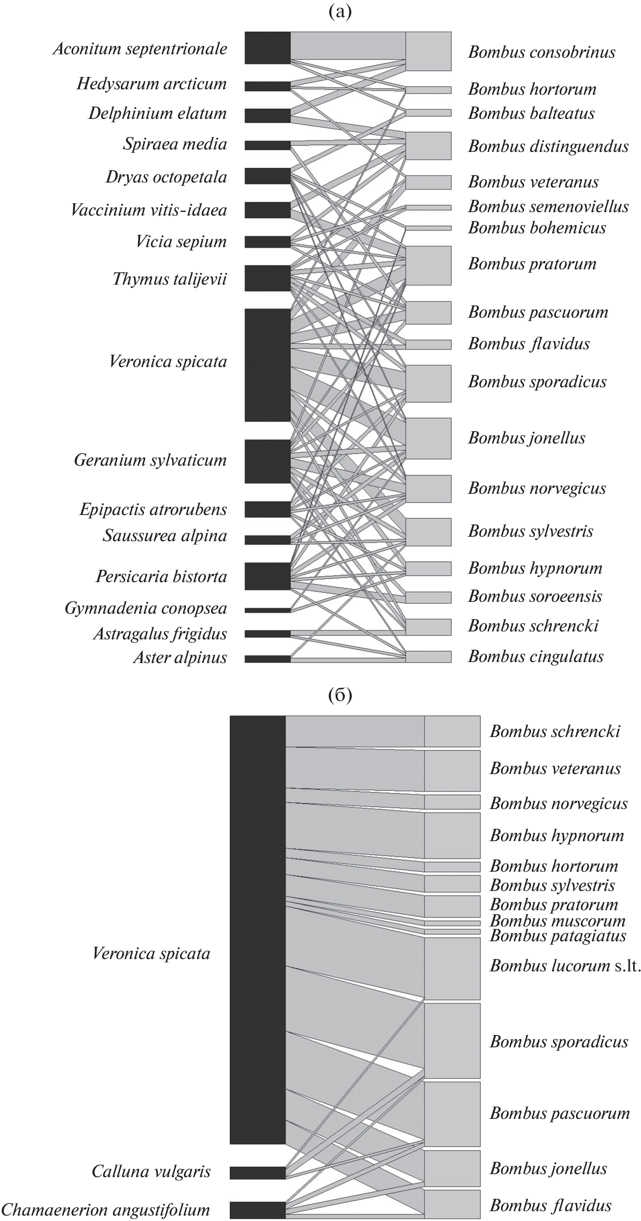 The low number of pollinating insects is the limiting factor for entomophilous plants in the north, and the situation is exacerbated by a short growing season and often unfavorable weather conditions for their life. The paper presents the results of studying the complex of pollinators of the specialized melittophilic species Veronica spicata at the northern limit of its distribution. It is shown that the structure of this complex is determined by the structural features of V. spicata flowers, the latitudinal position, and the fferentiation of ecological niches of the species in the north. Unlike other parts of the range, where solitary bees play an important role in the pollination of V. spicata, this function in the north is performed by representatives of the genus Bombus Latr. (Hymenoptera, Apidae). Considering the level of species diversity and population structure, the pollinator complex of V. spicata is based on short proboscis species of umblebees: Bombus lucorum s.l., B. jonellus, B. pratorum, B. sporadicus, and medium proboscis B. pascuorum. In accordance with the differentiation of ecological niches of V. spicata in the north, differences in the structure of the pollinator complex and foraging strategies of bumblebees were revealed.