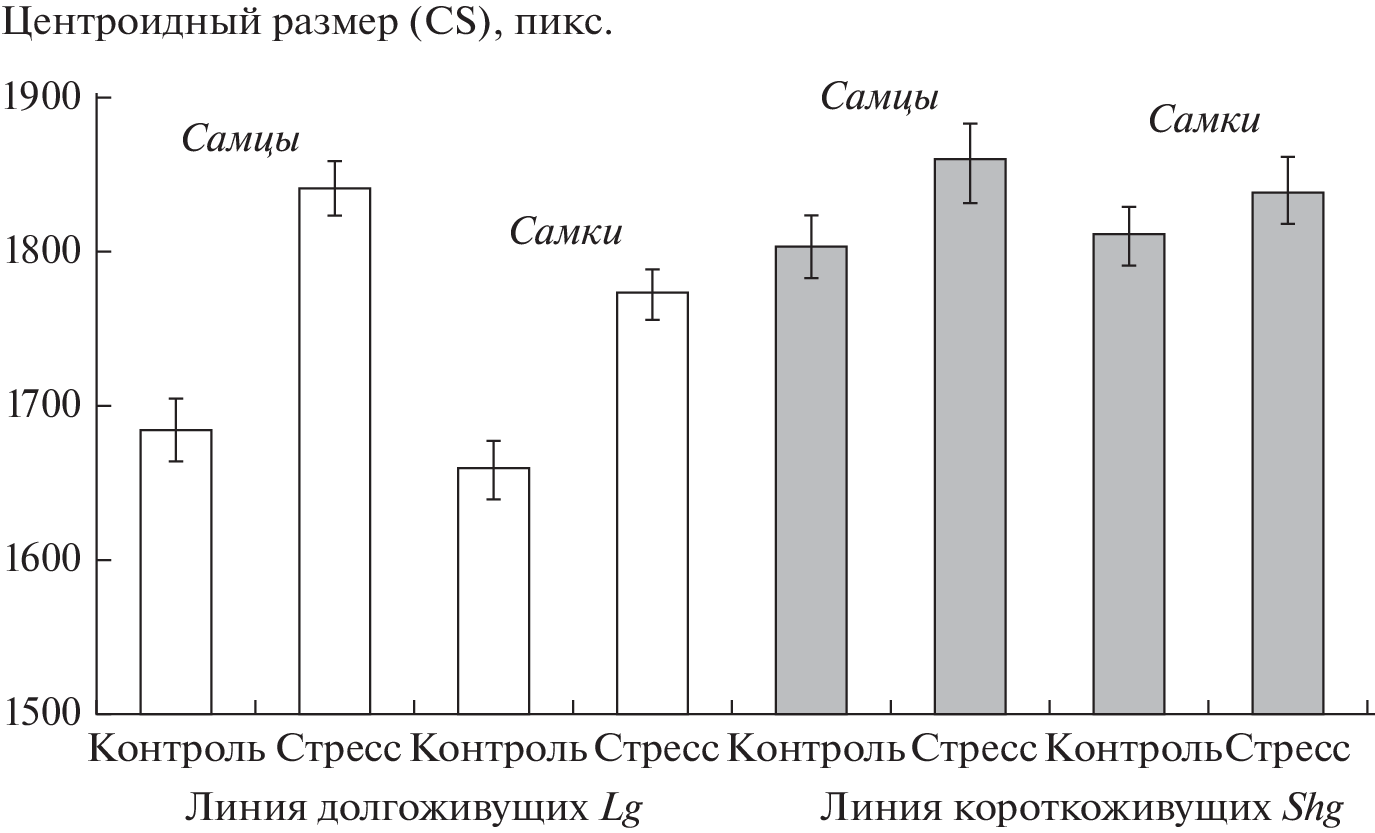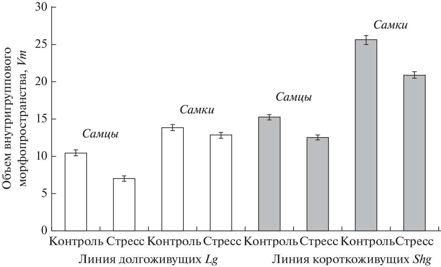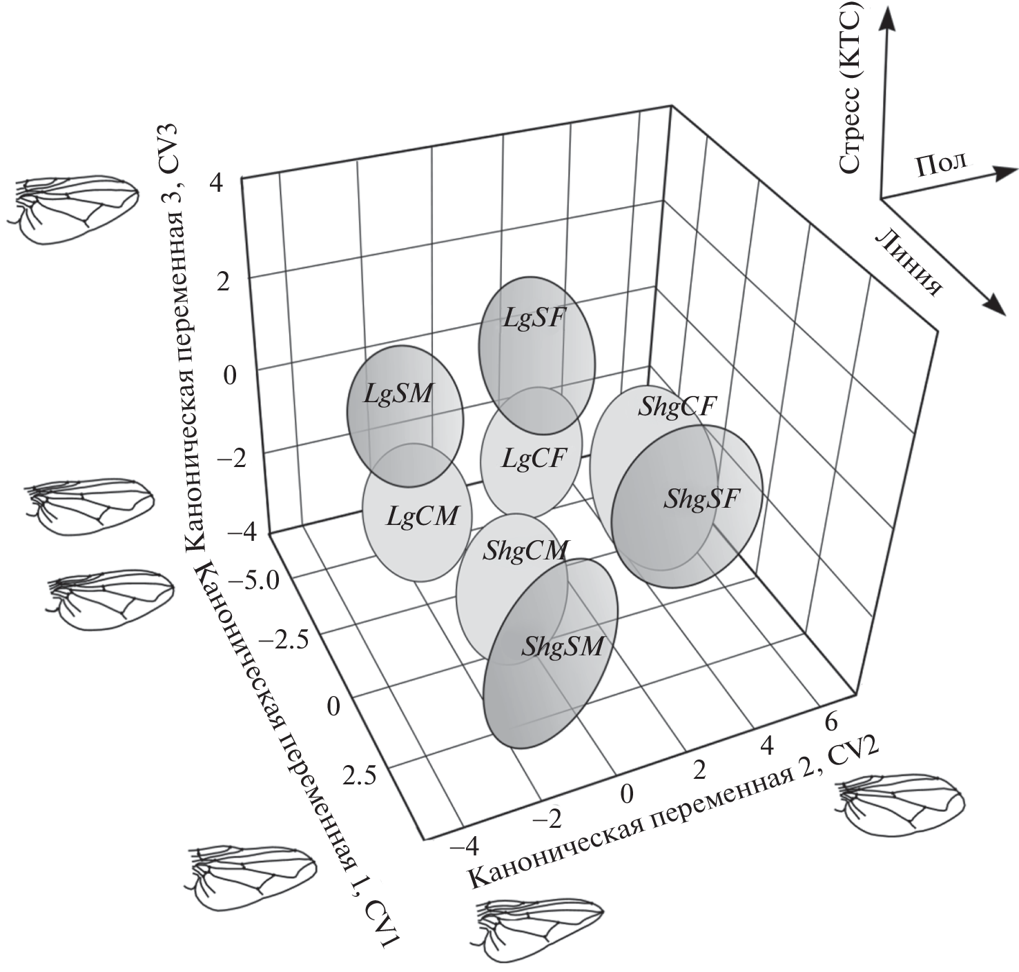 The morphogenetic consequences of short-term heat stress (SHS) were studied in two housefly lines that were massively selected for lifespan based on assessing the variability of the adult wing using geometric morphometry methods. Significant differences in wing size and shape were revealed between control and impact groups of different sexes in the Shg (short-lived) and Lg (long-lived) lines. The CTS effect manifested itself in an increase in the size of the wing and a directional change in its shape. The intergroup hierarchy of sex and stress-induced differences is expressed equally in both strains of flies. The range of linear differences is significantly higher than gender differences, which in turn are higher than the level of stress-induced ones. The instability of the adult wing development (Vm) of the Shg line is significantly higher than that of the Lg line, and higher in all groups of females, but in most cases significantly lower in impact groups (taking into account the increase in size, the latter may be associated with the effect of hormesis). It is hypothesized that the directed morphogenetic effects of CTS are based on hidden species-specific modifications, the appearance of which in the phenotype is caused by stress-induced epigenetic rearrangements of the genome, causing similar morphological changes in the wing in groups of males and females of adults of both lines. The phenotypic plasticity of lines during selection for different life spans and changes caused by CTC directly indicate the reality of stress-induced rapid morphogenetic rearrangements during a sharp change in environmental conditions.
