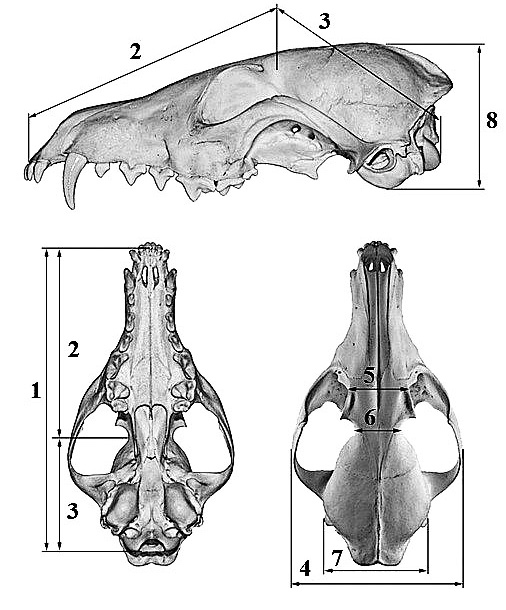 Рис. 1. Схема измерения признаков черепа: 1 – кондилобазальная длина, 2 – длина лицевого отдела, 3 – длина мозгового отдела, 4 – скуловая ширина, 5 – межглазничная ширина, 6 – заглазничная ширина, 7 – мастоидная ширина, 8 – высота черепа в области слуховых капсул.