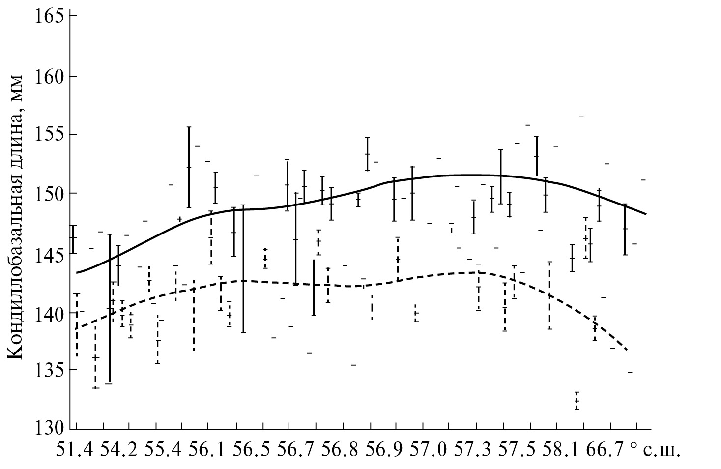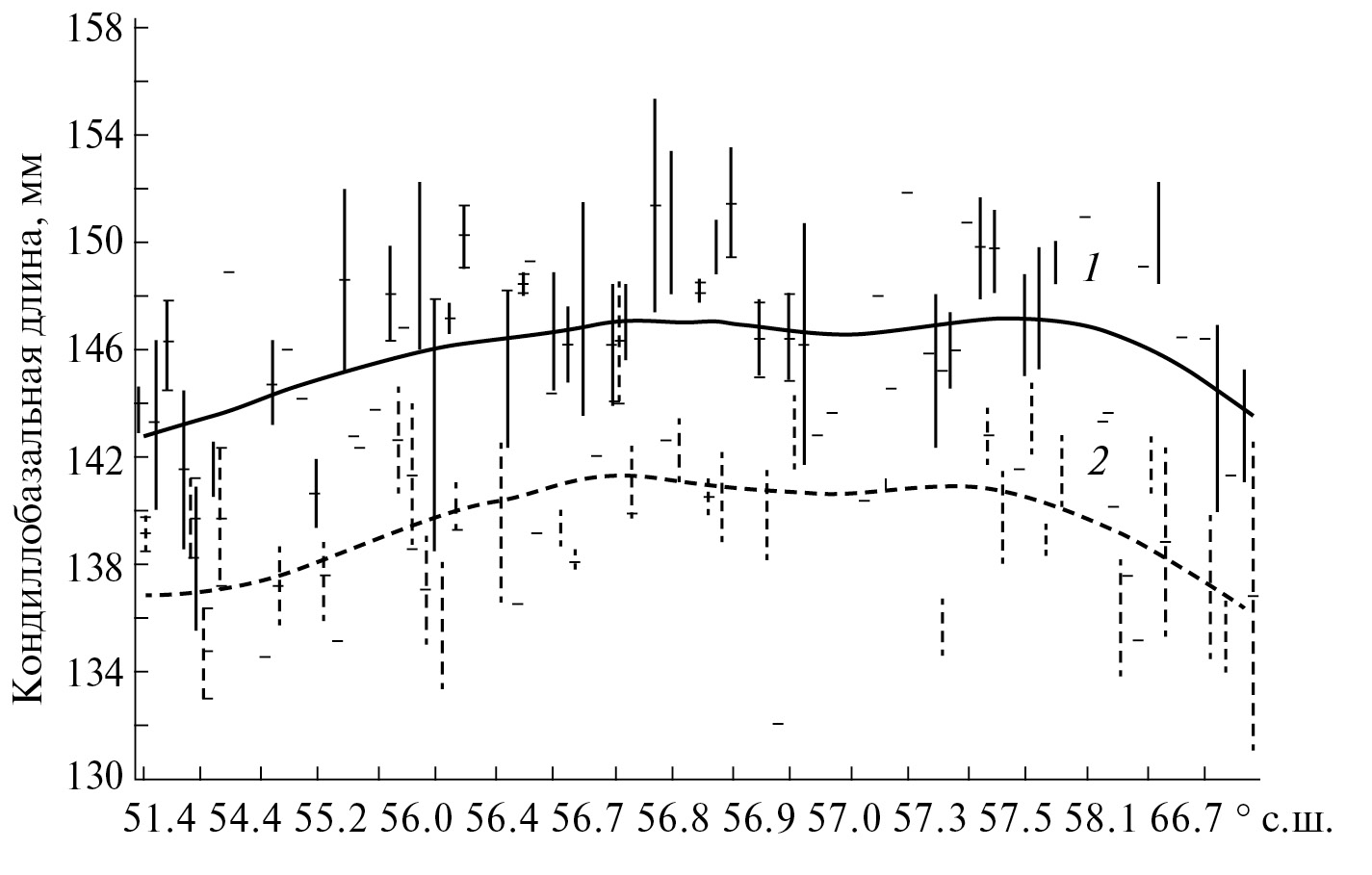 Рис. 3. Изменение кондилобазальной длины черепа взрослых самцов (1) и самок (2) в градиенте широты: линия – аппроксимация среднего по методу взвешенных наименьших квадратов, точки – единичные наблюдения; точки и вертикальные линии – среднее ± SE. Самцы F(51;170) = 1.8; p = 0.0027; самки F(44;158) = 1.95; p = 0.0015.