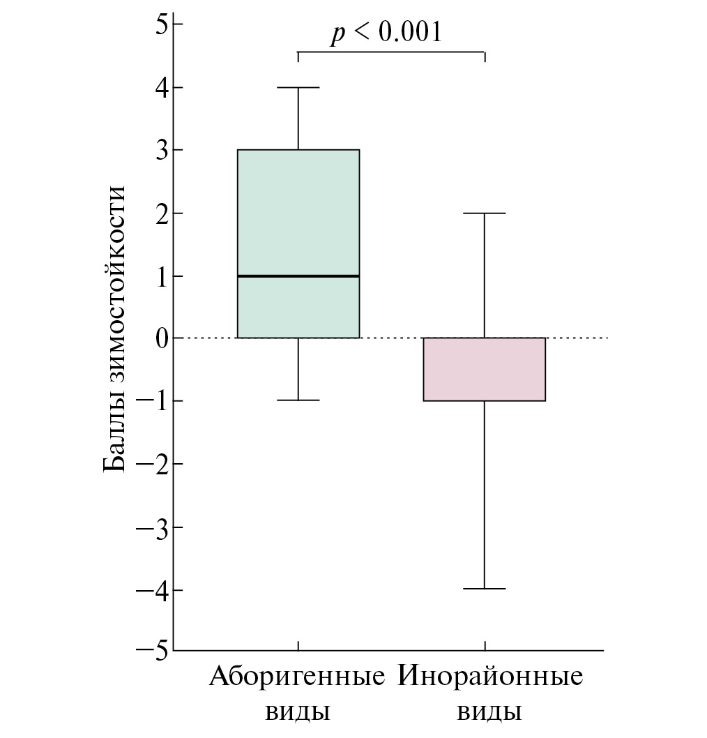 Дескриптивная статистика включала расчет медианы с межквартильным размахом. Единицей измерения в одном случае было минимальное значение зимостойкости, зафиксированное среди всей совокупности экземпляров того или иного вида, испытанных либо на солнце, либо в тени – отдельно для 2019 г. и многолетнего периода (т. е. всего 4 категории наблюдений). В другом случае единицей измерения была разность между минимальными значениями зимостойкости для каждого вида в 2019 г. и за многолетний период – отдельно для тех же 4 категорий. Объем выборок был следующий: аборигенные виды на открытых участках – 18 видов, в затенении – 16; инорайонные виды на открытых участках – 53, в затенении – 4. Выборки сравнивали попарно. Сравнение двух выборок проводили с помощью критерия Манна-Уитни (U). Статистическую значимость оценивали рандомизационной техникой Монте-Карло (n = 99 999). Эффекты считали статистически значимыми при p ≤ 0.05. Расчеты и графические построения выполнены в пакетах PAST (v. 4.13; [7]) и GraphPad Prism9 (GraphPad Software, Inc.).