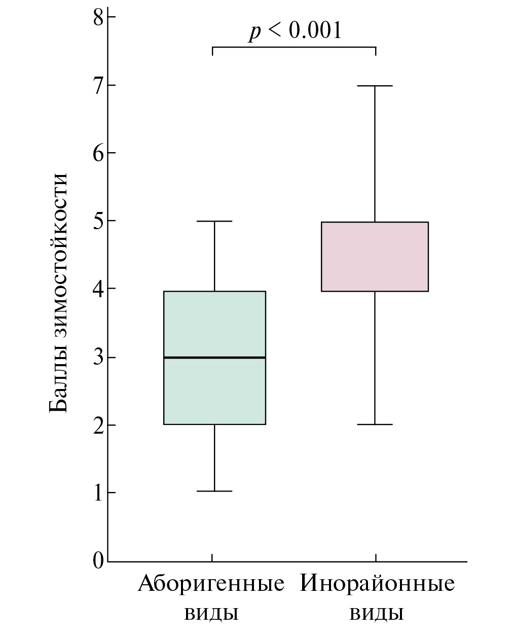 Рис. 2. Минимальная зимостойкость за многолетний период на открытых местах у аборигенных и инорайонных видов. Здесь и на рис. 3 коробчатая диаграмма показывает межквартильный размах, горизонтальная линия внутри – медиана, вертикальные линии – минимальный и максимальный диапазоны баллов.