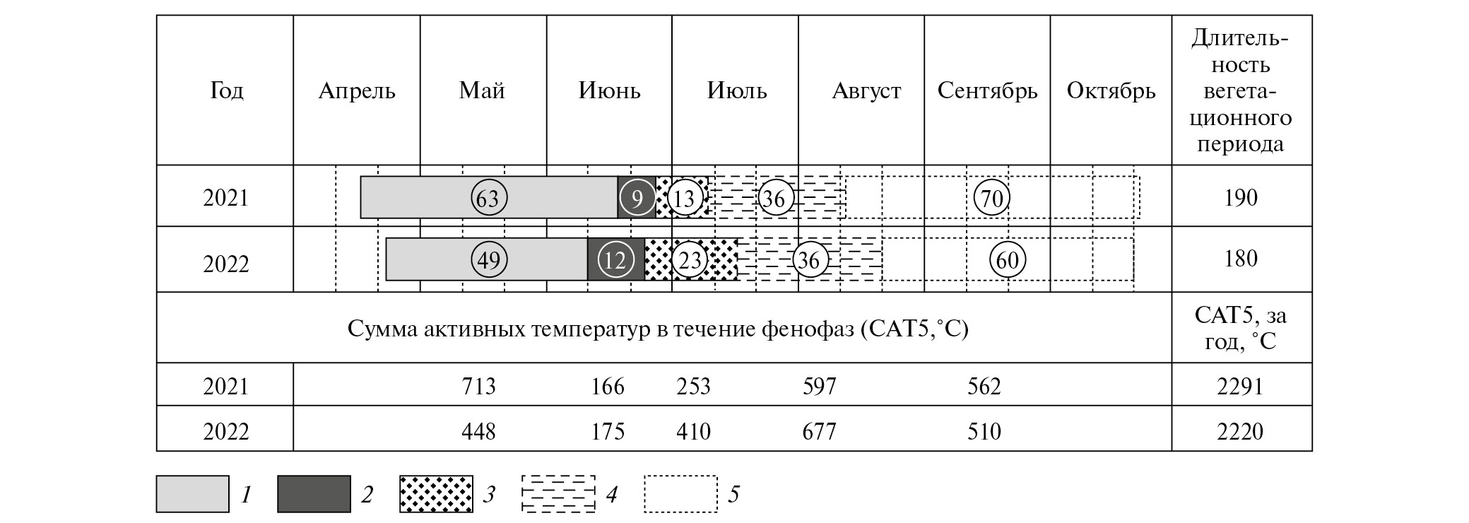 Рис. 1. Сроки прохождения фенофаз растениями Heracleum sosnowskyi и теплообеспеченность территории суммой активных температур > 5 °С (САТ5, °С): 1 – появление всходов и вегетативный рост растений, 2 – бутонизация, 3 – цветение, 4 – плодоношение, 5 – расселение плодов и отмирание надземной части растений. Цифры в кружках обозначают продолжительность фенофаз в днях. Представлены данные для ЦП 1–6.