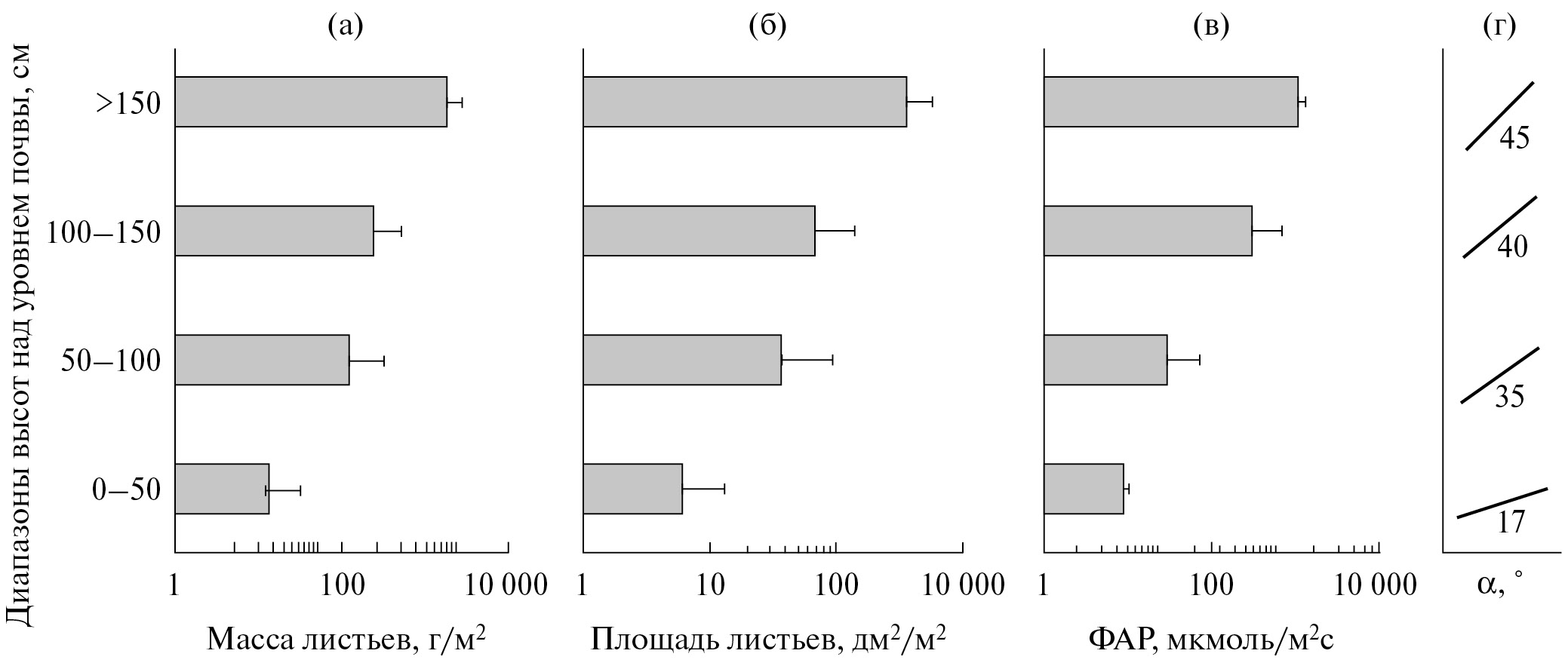 Рис. 3. Распределение массы (а) и площади (б) листьев, наклон плоскости листовой пластинки (в) и поступление фотосинтетически активной радиации (ФАР) в полуденное время суток (г) в ЦП Heracleum sosnowskyi. Ось ординат представлена в виде логарифмической шкалы (N = 18 площадок, июнь – июль 2021 и 2022 гг.). Представлены данные для ЦП 1–6.
