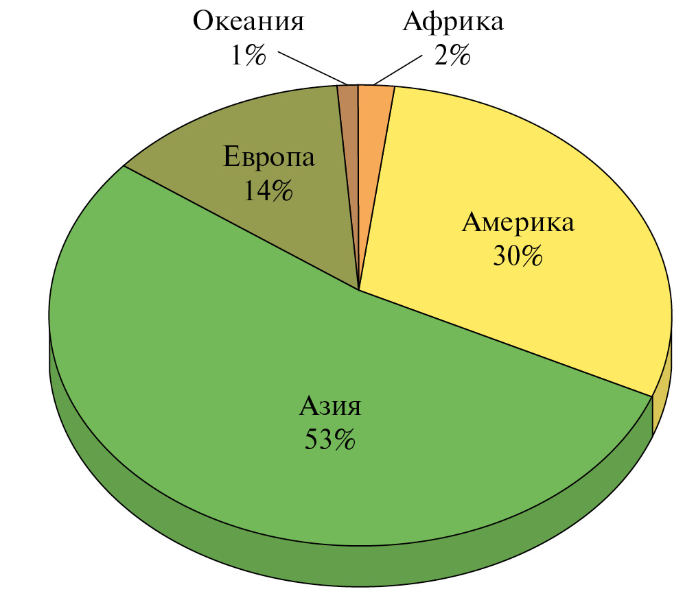 Пестициды – это химические вещества, которые используют для защиты растений от вредителей (насекомые, мелкие животные, грибы, бактерии, нежелательные дикорастущие растения), в контроле общественного здоровья (медицинская, бытовая дезинсекция) и для защиты животных от переносчиков трансмиссивных болезней [12, 13]. За 30 лет мировое использование пестицидов увеличилось более чем в 1.5 раза – примерно с 2.3 мегатонн в 1980 г. до 4 мегатонн в 2010 г. в годовом исчислении. После этого уровень потребления пестицидов характеризовался незначительным приростом и оставался относительно постоянным, примерно 4.1 мегатонны в год с 2011 г. по 2018 г. Анализ глобального использования пестицидов за период с 1990 г. по 2018 г. выявил основной вклад Азии, на долю которой приходилось около 53% от общего их потребления (см. рис. 1), Северная и Южная Америки использовали около 30%, Европа – 14%, Африка – около 2%, на долю Океании приходился оставшийся 1%. В топ-10 стран мира по использованию пестицидов в среднем за период с 1990 г. по 2018 г. вошли Китай, США, Бразилия, Аргентина, Россия, Франция, Италия, Япония, Колумбия и Канада [12].