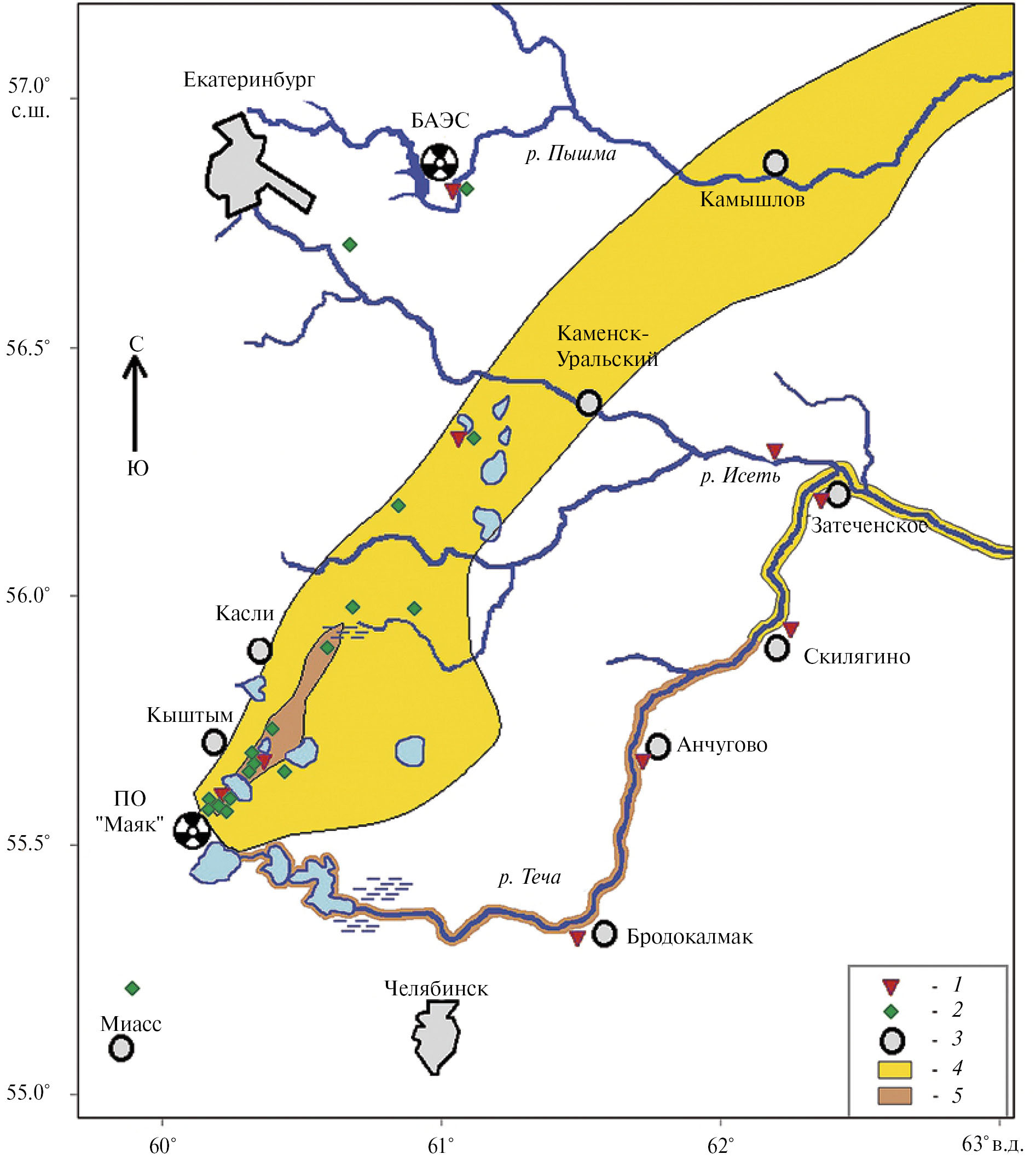 В течение всего периода деятельности ПО “Маяк” прилегающие территории подвергались загрязнению аварийными и штатными выбросами техногенных радионуклидов, а также водными аэрозолями, сдуваемыми с промышленных водоемов [14, 15]. Радиоэкологическая ситуация в зоне влияния предприятия в хронологическом порядке определяется в основном двумя событиями: сбросом радиоактивных отходов в р. Течу (1949–1951 гг.) и Кыштымской аварией (1957 г.).