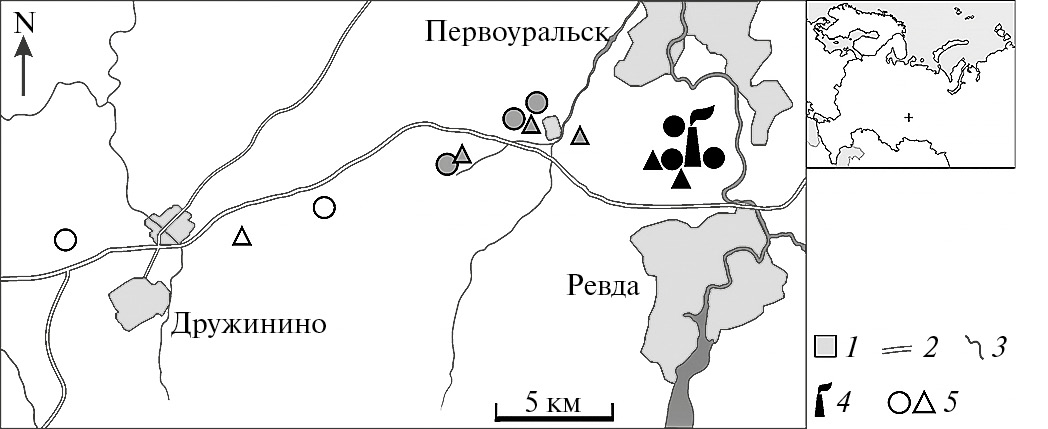 Рис. 1. Расположение площадок с искусственными гнездовьями в окрестностях СУМЗа: 1 – населенные пункты; 2 – шоссе; 3 – река; 4 – СУМЗ; 5 – участки (кружки – участки в лиственном лесу, треугольники – участки в хвойном лесу); незакрашенные, серые и черные значки – фоновая, буферная и импактная зоны соответственно.