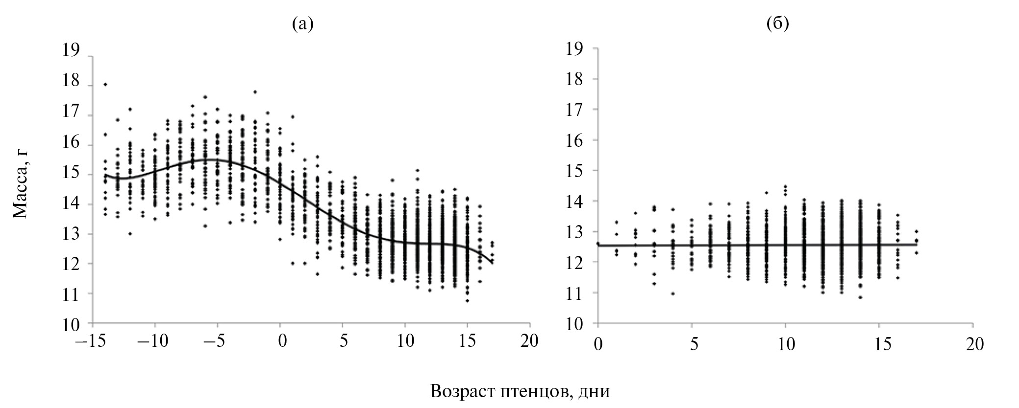 Рис. 2. Зависимость массы тела самок (а) и самцов (б) мухоловки-пеструшки от возраста птенцов. День вылупления принят за 0: слева от нуля – стадия насиживания кладки, справа – стадия выкармливания птенцов.