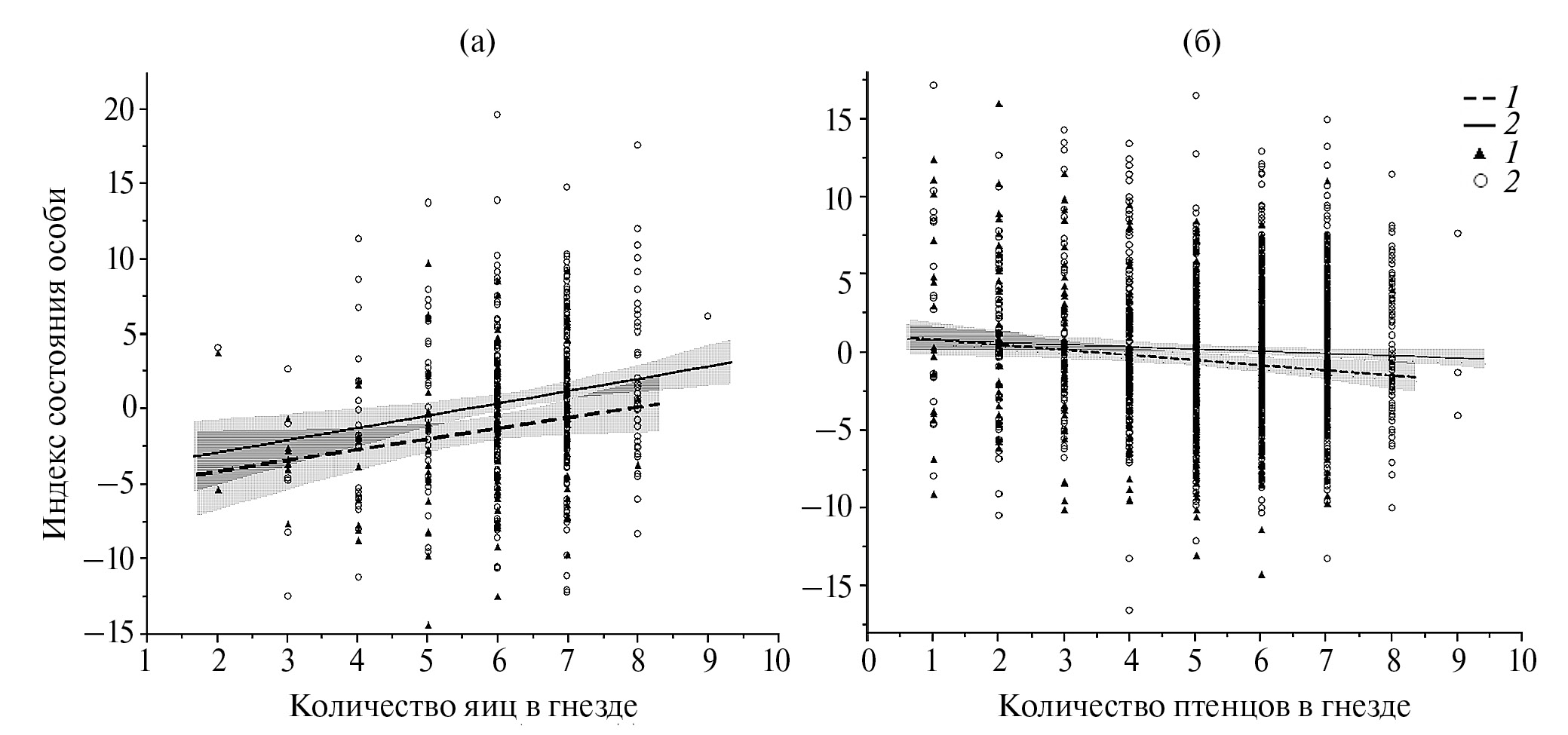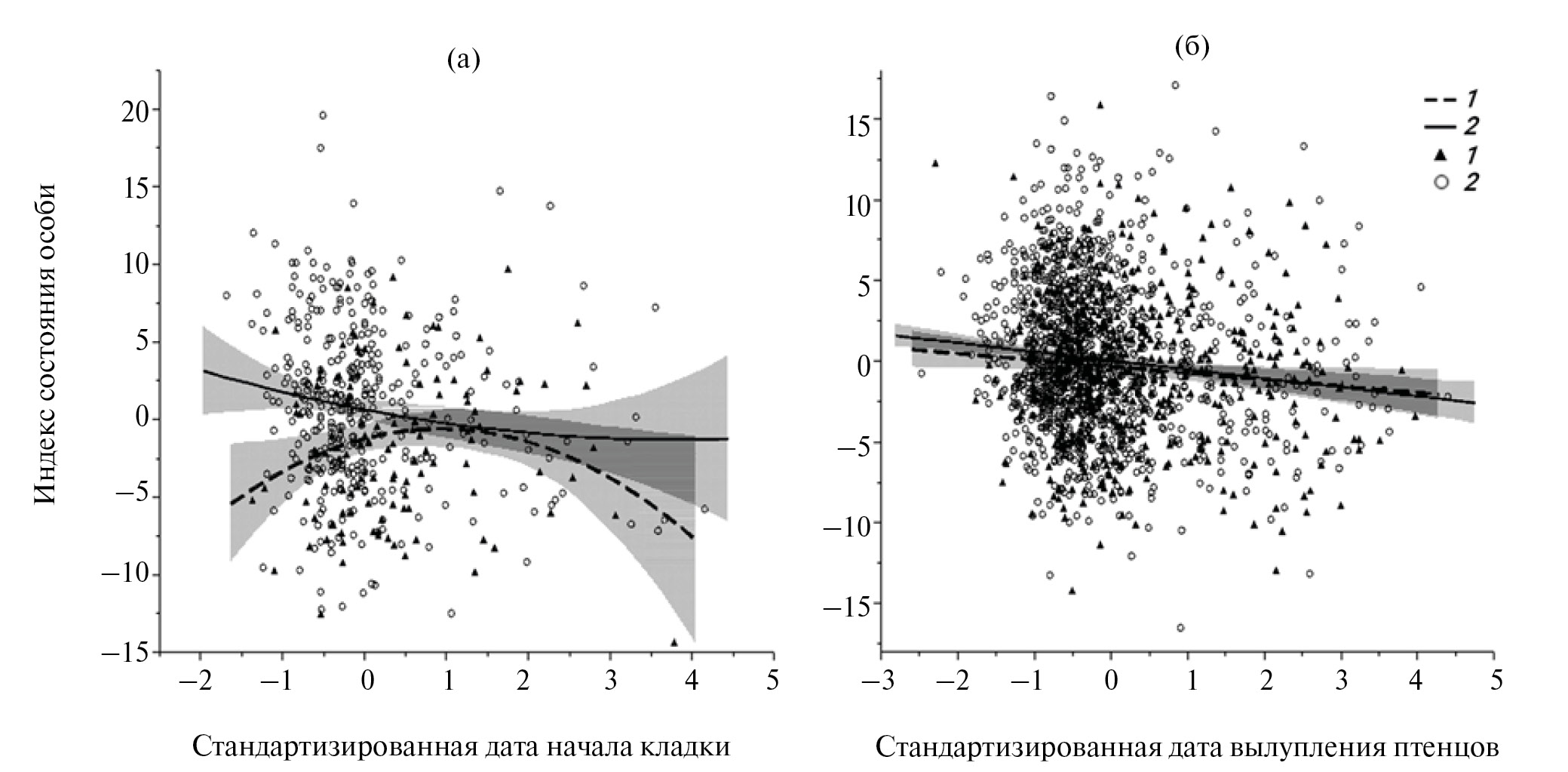 Рис. 3. Зависимость ИСО самок на стадии насиживания и выкармливания от дат начала кладки (а) и вылупления птенцов (б). Здесь и на рис. 4–6: 1 – молодые; 2 – старшие особи; закрашенная область – 95%-ный ДИ.