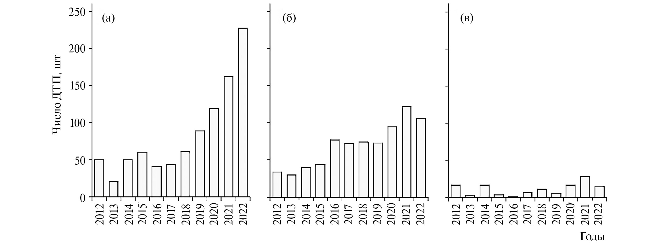 Зафиксированы столкновения (по убыванию числа случаев) с сибирской косулей (Capreolus pygargus), лосем (Alces alces), кабаном (Sus scrofa), медведем (Ursus arctos), лисицей (Vulpes vulpes), зайцем-беляком (Lepus timidus), тетеревом (Lyrurus tetrix) – 924, 767, 126, 7, 4, 2, 1 соответственно. Бóльшая часть ДТП приходится на инциденты с копытными млекопитающими. Из зарегистрированных за период 2012–2022 гг. столкновений с дикими животными 99% (1817 из 1831) составляют происшествия с копытными (лось, косуля, кабан), из них большинство (1691) – с косулей и лосем (рис. 2). Если для косули и лося число ДТП за рассматриваемый период существенно выросло (в 4.5 и 3.1 раза соответственно), то для кабана оно меняется слабо.