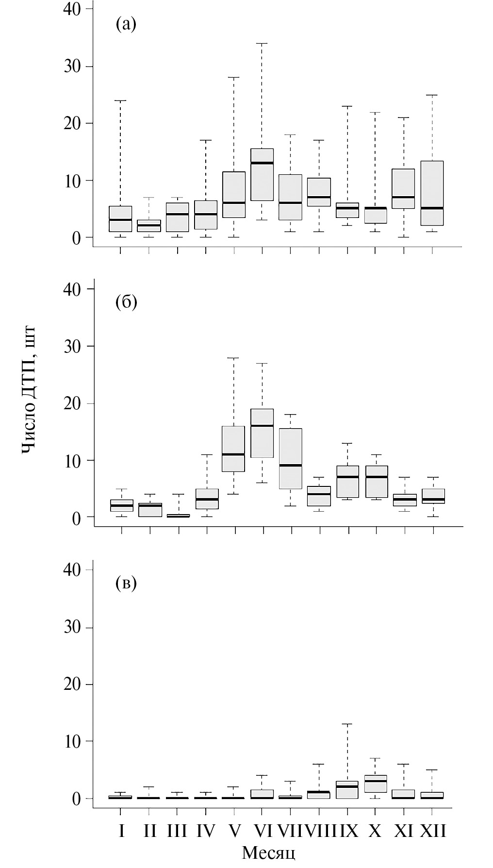 Рис. 3. Сезонная динамика абсолютного числа ДТП с копытными млекопитающими: а – косуля; б – лось; в – кабан. Линия, прямоугольник и усы обозначают медиану, межквартильный размах и диапазон значений (минимум – максимум) соответственно.