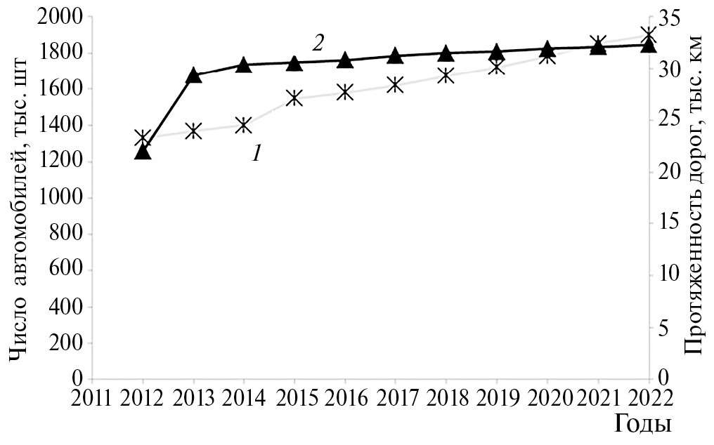 Рис. 5. Изменение числа автомобилей (1) и протяженности дорог (2) в Свердловской области в 2012‒2022 гг.