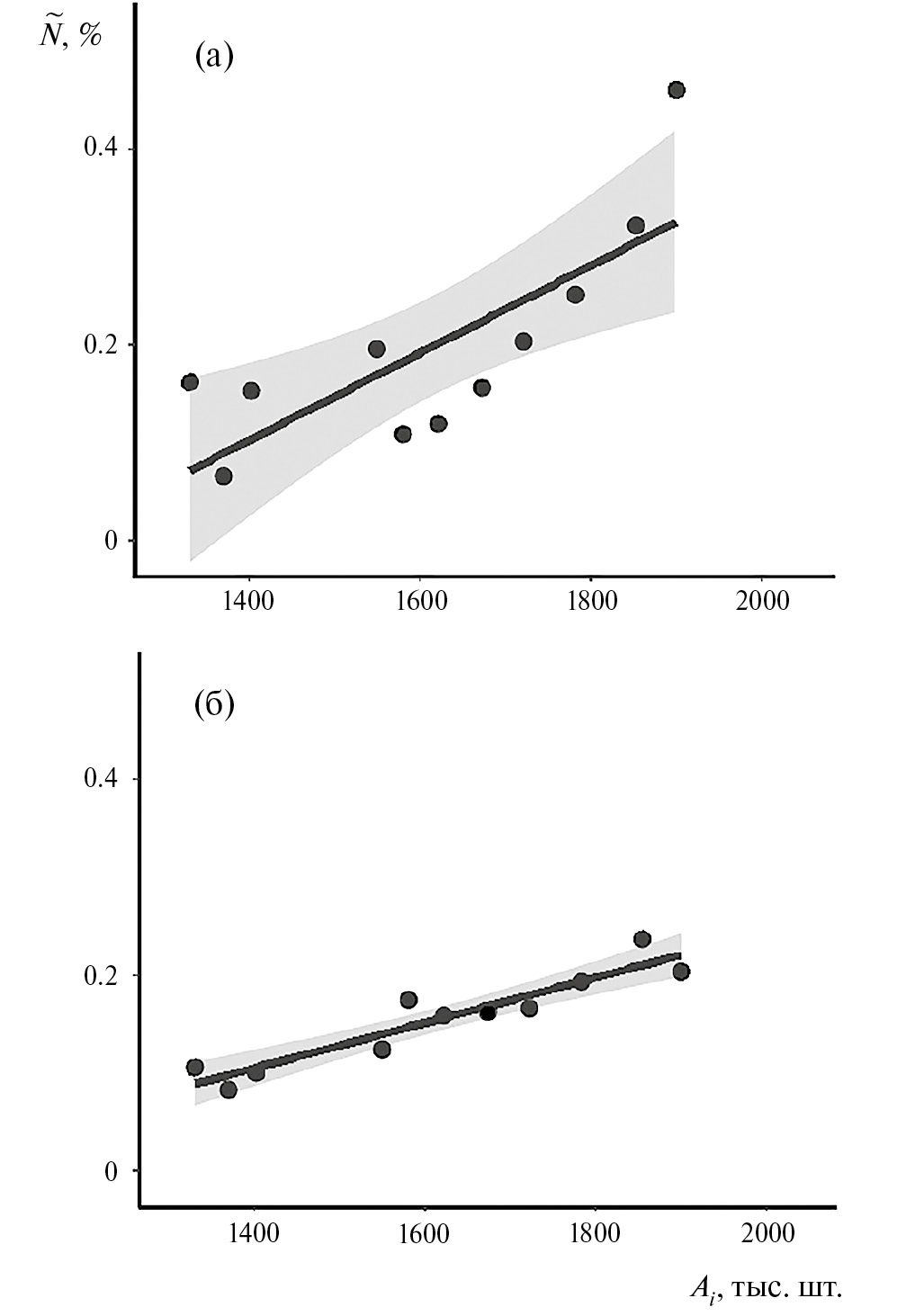 Рис. 6. Зависимость числа пострадавших в ДТП животных (в % от общей численности) от числа автомобилей (Ai): а – косуля (y = ‒5.22e-1 + 4.47e-7*x, R2 = 0.55, p < 0.001); б – лось (y = ‒2.19e-1 + 2.32e-7*x, R2 = 0.86, p < 0.001). Показаны исходные значения, линия регрессии и 95%-ный доверительный интервал.