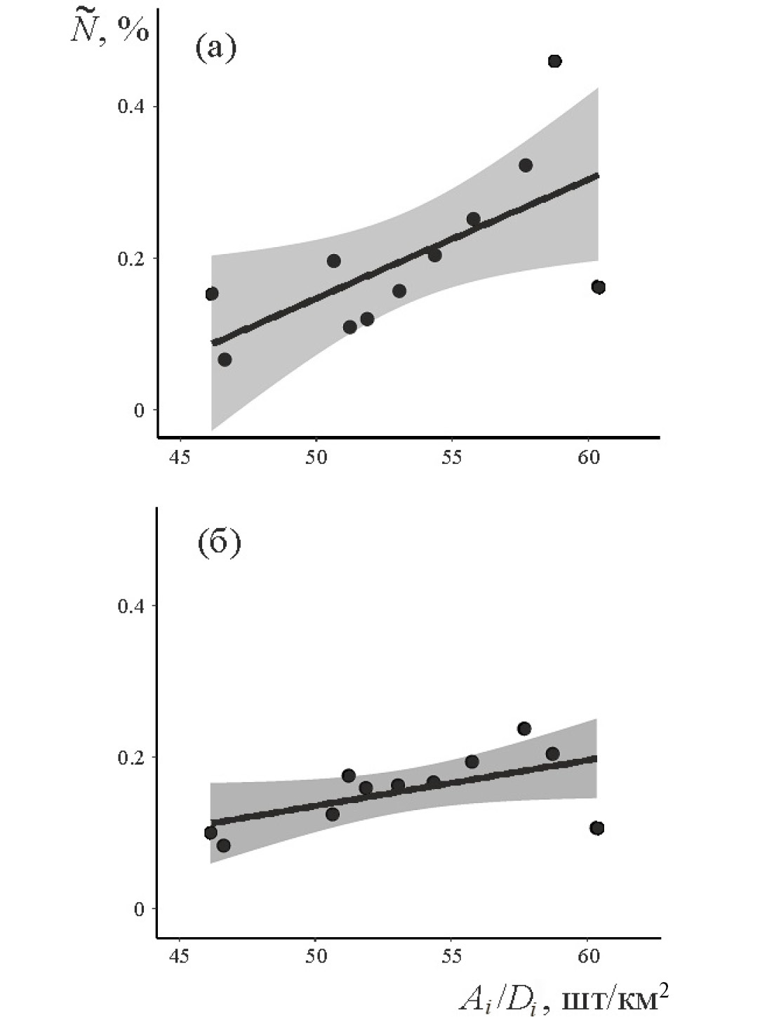 Рис. 7. Зависимость числа пострадавших в ДТП животных (в % от общей численности) от числа автомобилей, приходящихся на 1 км дороги (Ai /Di): a ‒ косуля (y = ‒6.37e-1+1.57e-2*x, R2 = 0.36, p = 0.03); б ‒ лось (y = ‒1.66e-1+6.03e-3*x, R2 = 0.27, p = 0.058). Показаны исходные значения, линия регрессии и 95%-ный доверительный интервал.