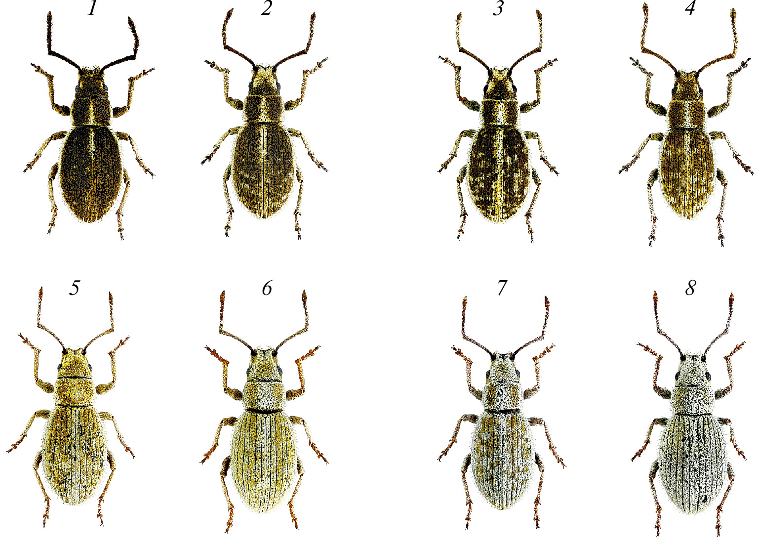 Ptochus porcellus — полиморфный вид, в том числе по окраске, с выраженными межпопуляционными различиями. Так, на песках надпойменной террасы р. Хопёр (Хопёрский заповедник) преобладают меланистические формы с контрастным рисунком (на почти черном фоне выражена светлая пришовная полоса и разбросаны мелкие светлые пятна) (рис. 1, 1–4), но изредка встречаются жуки светло-серые или с коричневым рисунком. Напротив, на суглинистых и меловых субстратах (например, в балке Шыбынды Оренбургской обл.) верх у большинства особей с неярким светло-коричневым рисунком либо почти однотонно светлый, а темные особи не встречаются (рис. 1, 5–8).