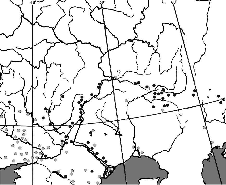 Материал. Россия. Курская обл. Большесолдатский р-н, дер. Нижняя Паровая, долина р. Суджа, 51.347893° N, 35.391373° E, 20.VII.2022 (Н. И. Дегтярев), 1 экз. (https://www.inaturalist.org/observations/ 128145637). Accessed on 20.01.2024 г.). Воронежская обл. Новохопёрский р-н, 2 км ЮВ с. Варварино, Хопёрский государственный природный заповедник, урочище Кучугоры, 51.1918° N, 41.7425° E, возвышенный участок, псаммофитная степь вблизи сосняка, 24.VI.2023, 6 экз.; там же, кошение по Centaurea majorovii Dumbadze, 25.VI.2023, 1 экз.; 4 км Ю с. Варварино, урочище Отрог, 51.1691° N, 41.7415° E, псаммофитная степь вблизи дубравы и сосняка, кошение, 23–25.VI.2023, 11 экз.; с. Алферовка, осыпающийся супесчаный склон правобережья в излучине р. Хопёр, 51.1939° N, 41.6683° E, 24.VI.2023, 6 экз.; там же, 25.VI.2023, 12 экз.; Воробьевский р-н, 3 км СВ с. Верхний Бык, 50.74° N, 41.29° E, 24.VII.2009, 1 экз. (Е. В. Аксененко). Саратовская обл. Хвалынский р-н, 1 км В с. Черный Затон, национальный парк «Хвалынский», 52.7556° N, 48.3343° E, сухая степь на склоне Волги, 7.VIII.2022, 2 экз.; 6 км СВ пос. Возрождение, 52.7020° N, 48.2890° E, солонец на берегу Волги, 17.V.2023, 3 экз.; 2 км В пос. Возрождение, меловой останец на высоком коренном берегу Волги (гора Белая), 52.6835° N, 48.24439° E, меловые обнажения, кошение по Kochia prostrata и Artemisia lercheana, 9.VIII.2022, 15 экз.; г. Хвалынск, урочище Три Шишки, 52.5352° N, 48.0836° E, меловые обнажения, на Krascheninnikovia ceratoides (L.) Gueldenst., 13.VII.2020, 6 экз.; там же, меловая степь, кошение, 3 экз.; Новобуракский р-н, окр. с. Тепловка, меловые обнажения на вершине степного склона, на Krascheninnikovia ceratoides, 10.VII.2012, 16 экз. (И. А. Забалуев); Вольский р-н, 1 км ЮВ пос. Клены, памятник природы «Меловые склоны с растениями-кальцефилами у г. Вольска», 52.070° N, 47.4956° E, меловые степи и осыпи, ночное кошение, 24.VII.2020, 11 экз.; там же, меловые степи, 25.VII.2020, 4 экз.; Аркадакский р-н, c. Малиновка, холмы на левобережье р. Хопёр, 51.784689° N, 43.438403° E, 14.VI.2023 (И. Матершев), 1 экз. (https://www.inaturalist. org/observations/167433622); Саратовский р-н, окр. с. Поповка, 51.4258° N, 45.5789° E, псаммофитная степь, кошение, 17.VI.2015 (И. А. Забалуев), 1 экз.; 4 км ЮВ с. Рыбушка, 51.2431° N 45.4988° E, степной склон, на Krascheninnikovia ceratoides, 27.VI.2015 (И. А. Забалуев), 3 экз.; Красноармейский р-н, 5 км В c. Меловое, высокий правый берег Волги, 50.7707° N, 45.7021° E, ксерофитная супесчаная осыпь, на Alyssum sp., 18.V.2023: 1 экз.; там же, ночное кошение, 1 экз.; там же, меловая степь, 1 экз.; 1.5 км СВ с. Белогорское, меловой утес на берегу Волги, 50.6550° N, 45.6479° E, кошение по Astragalus zingeri Korsh., Hedysarum grandiflorum Pall. и Atraphaxis frutescens (L.) K. Koch, 3.VI.2022, 3 экз.; 2 км СВ с. Белогорское, 50.6601° N, 45.6448° E, обнажения с редкотравной растительностью на сероцветных опоках, 20.V.2023, 2 экз.; 9 км ЮВ дер. Белогорское, памятник природы «Даниловская балка», 50.5793° N, 45.6937° E, ксеротермный склон, петрофитная степь, 3 экз.; там же, сероопоковые мелкощебнистые склоны, 50.5798° N, 45.6948° E, кошение в ксерофитных ассоциациях со степными полынями, 4.VI.2022, 4 экз.; там же, петрофитная степь, 19.V.2023, 2 экз.; там же, на Alyssum tortuosum Waldst. et Kit. ex Willd., 1 экз.; там же, на Artemisia lercheana, 2 экз. Волгоградская обл. Камышинский р-н, c. Щербатовка, памятник природы «Щербатовская балка», 50.492373° N, 45.701955° E, 26.VII.2013 (И. М. Пристрем), 1 экз. (https://www.inaturalist.org/observations/51000539); Кумылженский р-н, окр. станицы Букановская, природный парк «Нижнехопёрский», меловые горы, 49.69° N, 42.37° E, 17.VII.2008 (Д. М. Астахов), 1 экз.; Серафимовичский р-н, станица Усть-Хопёрская, левобережье р. Дон, 49.574967° N, 42.43523° E (И. М. Пристрем), 1 экз. (https://www.inaturalist.org/observations/48925078); Ольховский р-н, 3 км СВ дер. Захаровка, Каменнобродские меловые горы, 49.7268° N, 44.3854° E, меловой склон, ночное кошение, 29.V.2019, 3 экз.; 