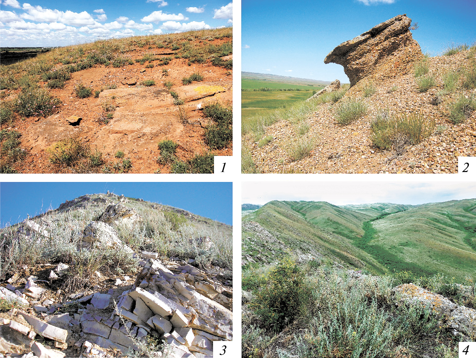 1 – меловые ландшафты в природном парке «Донской» (Волгоградская обл.), 2 – меловые горы в балке Шыбынды (Оренбургская обл.), 3 – песчаные степи в урочище Шубарагаш (Оренбургская обл.), 4 – ксерофитные песчано-глинистые склоны урочища «Атаманова гора» (Оренбургская обл.)