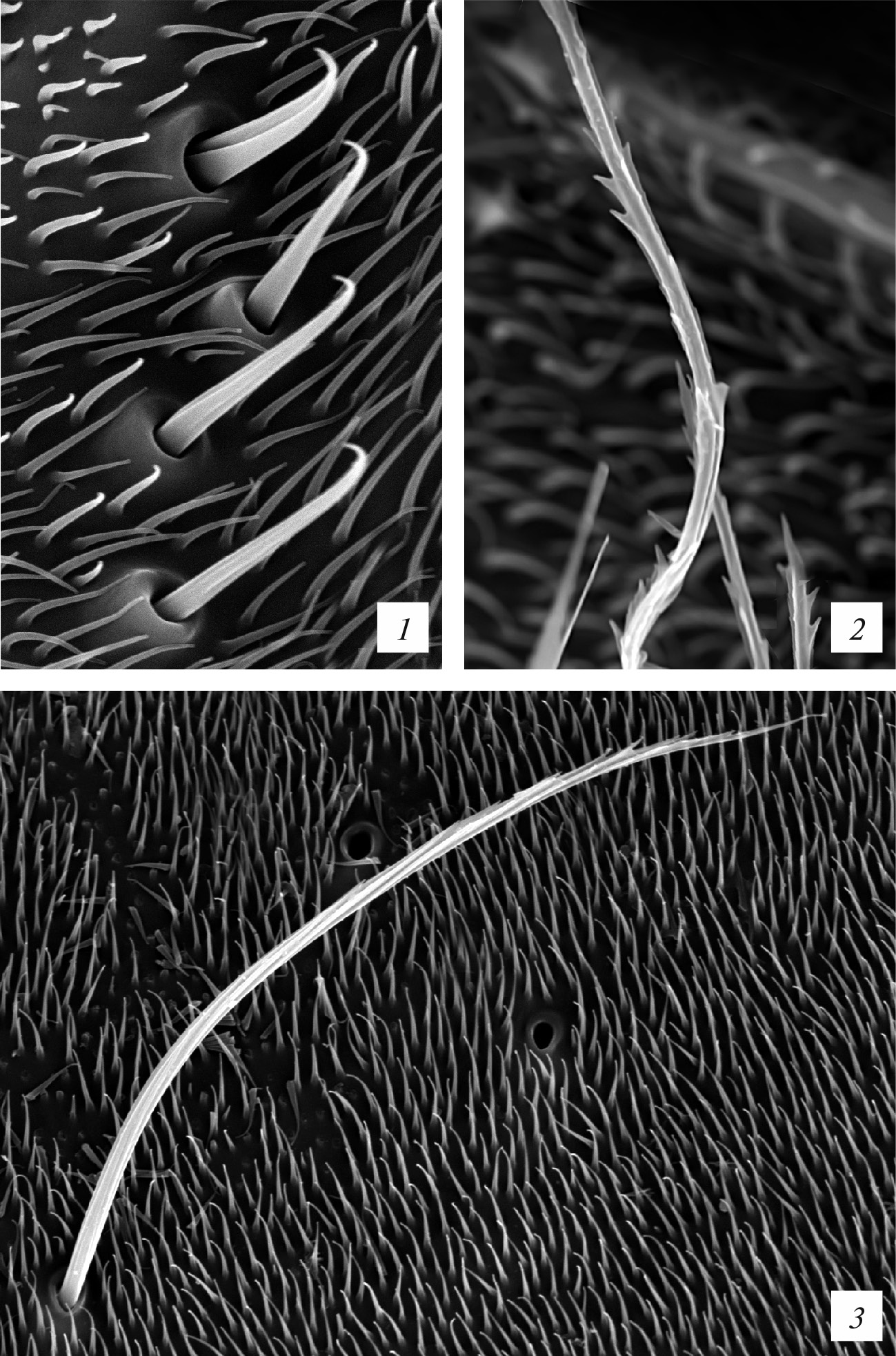 Рис. 4. Simuliidae, имаго, щетинки груди под СЭМ (1 – самец; 2, 3 – самка)