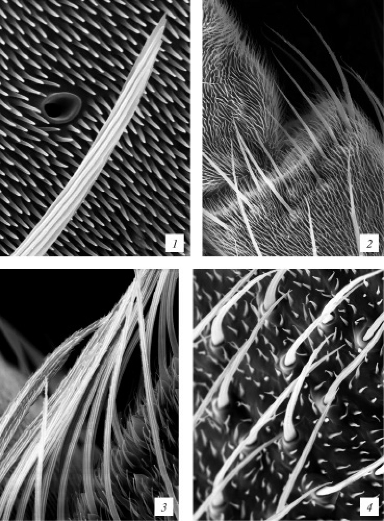Рис. 3. Simuliidae, имаго, щетинки и чешуйки груди под СЭМ (1, 2, 4 – самка; 3 – самец)