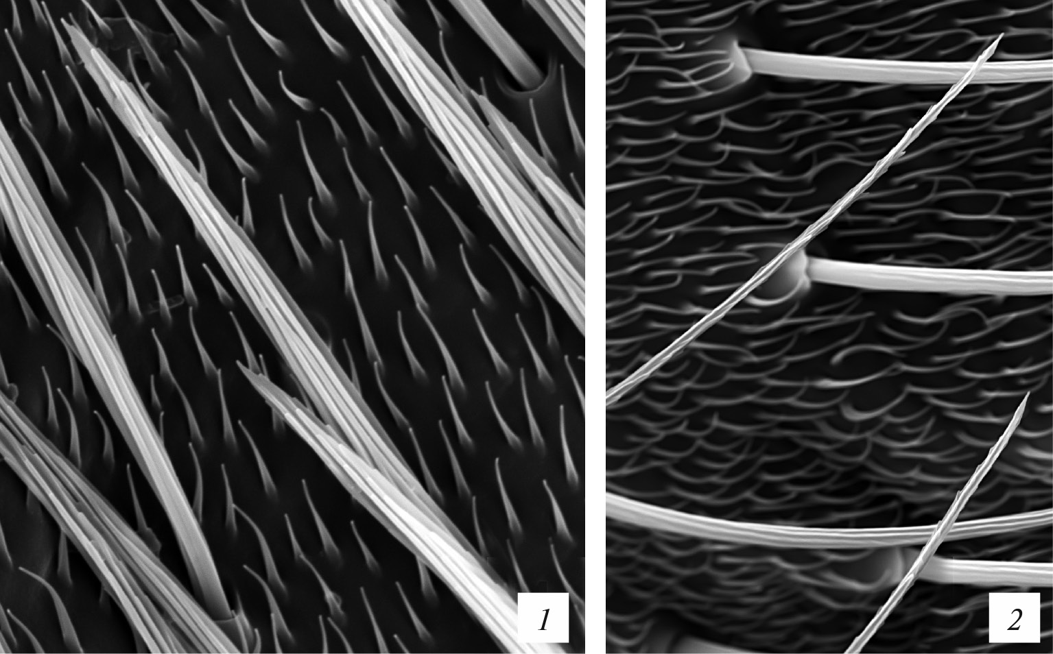1 – Simulium ornatum Meigen, самец, чешуйки наружной поверхности бедра, ×7700; 2 – Cnephia pallipes (Fries), самка, щетинки I сегмента брюшка, ×6100
