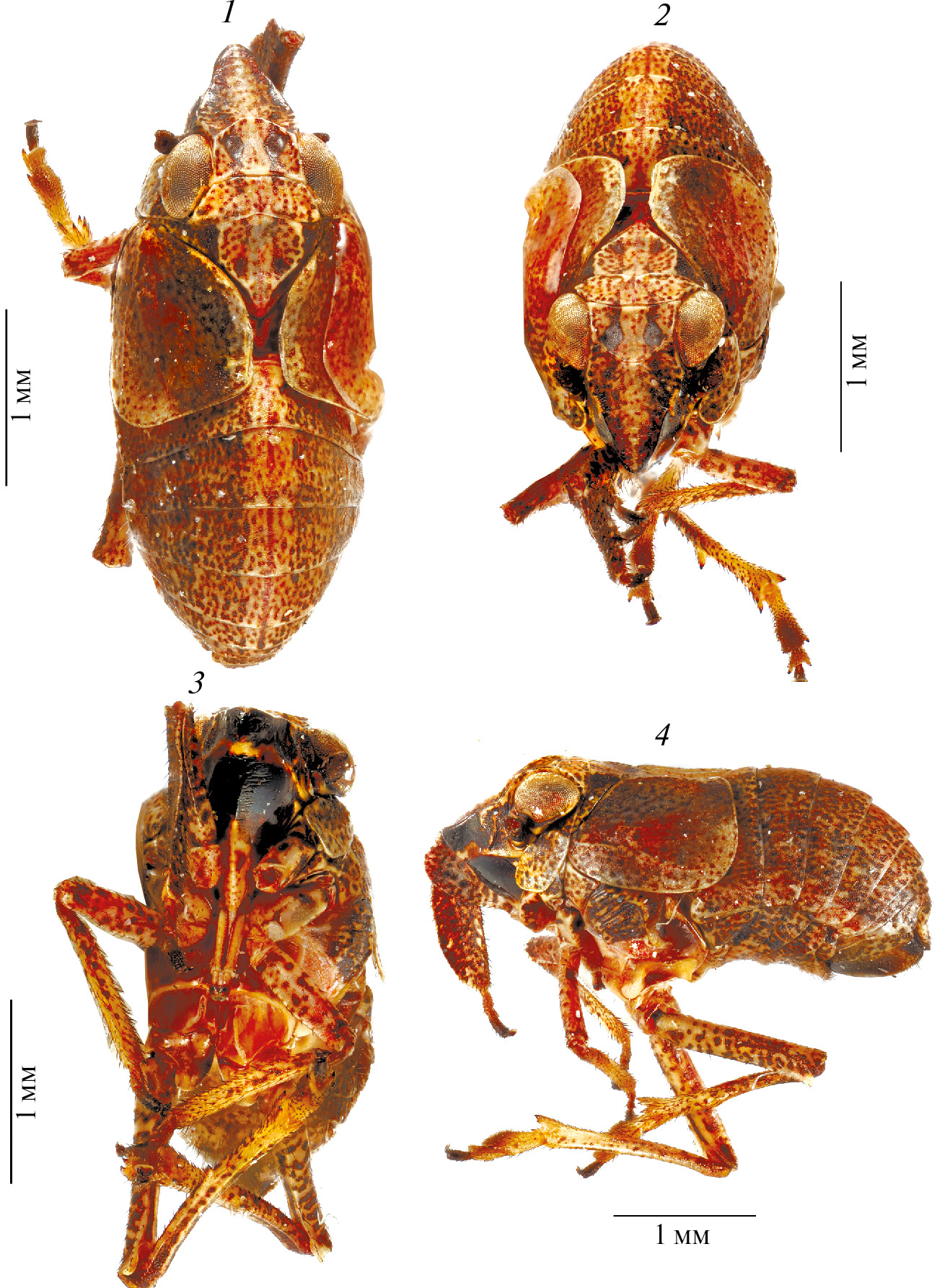 Самка (рис. 1, 1–4; 2, 1–5; 3, 1–5). Имеет характерный габитус, свойственный самкам большинства видов трибы Caliscelini, отличия касаются главным образом строения головы.
