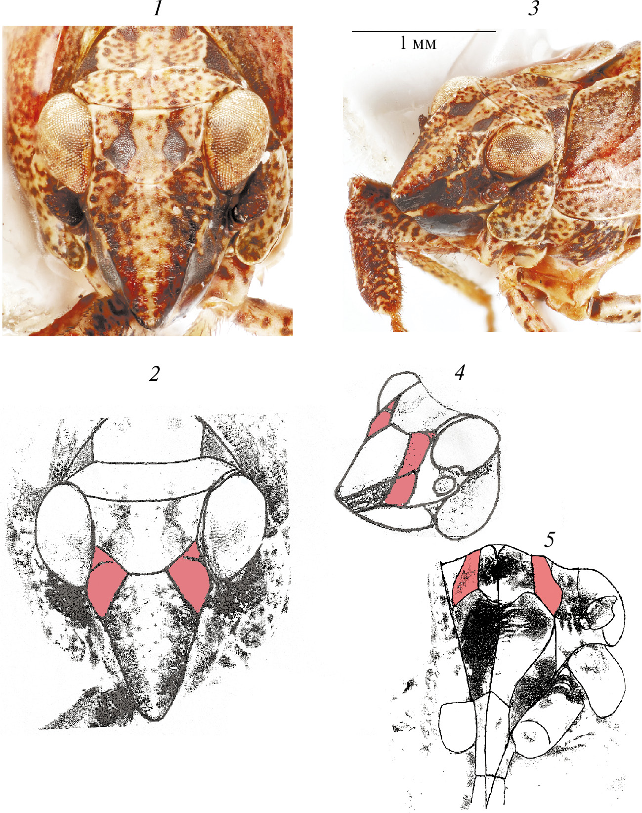 1 – голова и переднеспинка, вид спереди-сверху; 2 – то же, графически выделена система килей; 3 – передняя часть тела косо сбоку-сверху; 4 – то же, графически выделена система килей, как на рис. 2; 5 – голова, графически выделена система швов и килей как на рис. 2, 2, 4, На рис. 2, 2, 2, 4 и 2, 5 цветом выделены латеральные поля метопы. Фотографии В. В. Нейморовца