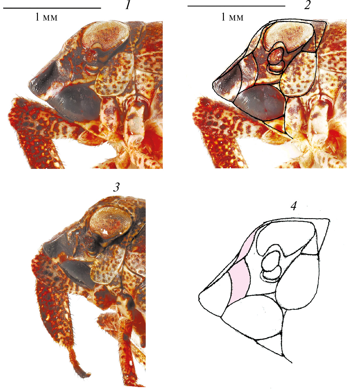1 – передняя часть тела сбоку; 2 – то же, графически выделена система килей на рис. 2, 1; 3 – передняя часть тела сбоку, другой экземпляр; 4 - графически выделена система килей на рис. 3, 2; заливкой выделено латеральное поле метопы. Фотографии В. В. Нейморовца