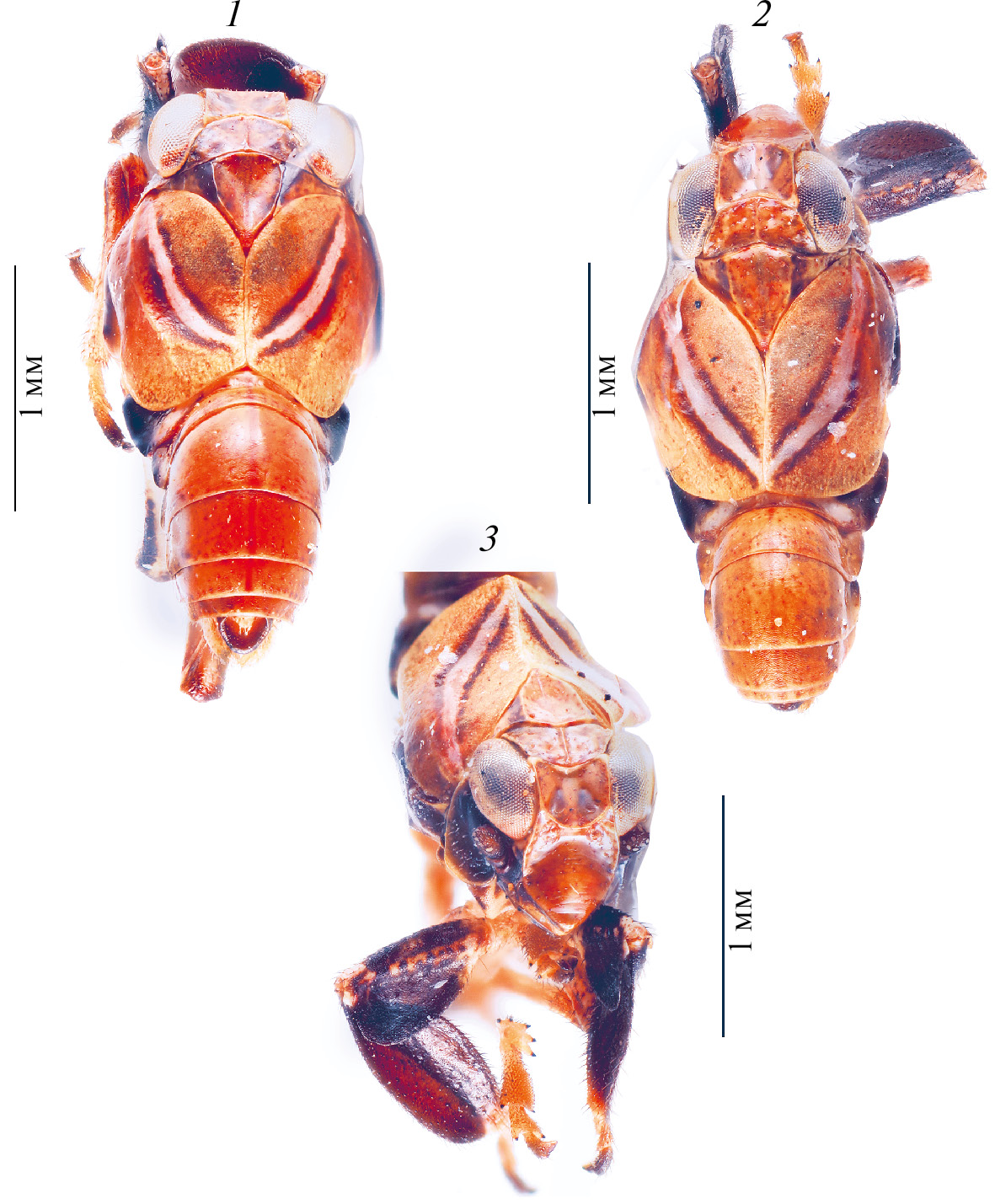 1 – паратип, вид сверху и немного сзади; 2 – голотип, вид сверху; 3 – то же, вид сверху-спереди. Фотографии В. В. Нейморовца