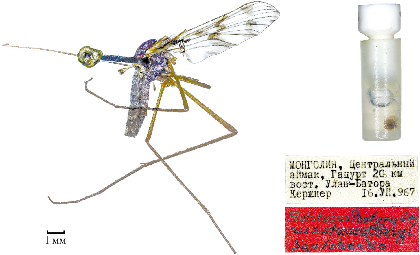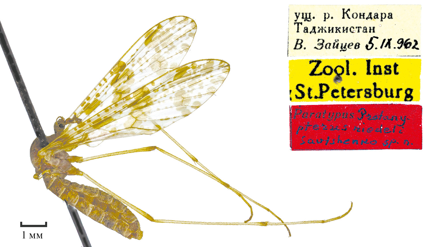 riedeli Savtshenko, 1974 (Савченко, 1974: 1982 (Protanyderus)) (рис. 1). Вид описан по самцу и двум самкам. Голотип: самец, «Таджикская ССР, Гиссарский хребет, ущелье Кондара 03.IX.1964 (Е. Луппова)», и паратип, самка, «Ущ.[елье] р.[еки] Кондара, Таджикистан, 5.IX.[1]962 (В. [Ф.] Зайцев)» хранятся в ИЗУ. Паратип: самка, «Ущ.[елье] р.[еки] Кондара, Таджикистан, 5.IX.[1]962 (В. [Ф.] Зайцев)», «Zool. Inst. St. Petersburg», «Paratypus Protanypterus riedeli Savtshenko sp. n.». Инвентарный номер INS_DIP_0000174. На типовой этикетке паратипа родовое название ошибочно указано как «Protanypterus», в то время как в первоописании (Savtshenko, 1974: 1982) и в каталоге типовых экземпляров (Кандыбина и др., 1987: 7) — как «Protanyderus». У паратипа в левой антенне сохранились только скапус и педицелл; утрачены левые передняя и средняя и правая средняя ноги, в правом жужжальце нет булавы. В остальном экземпляр в хорошем состоянии.