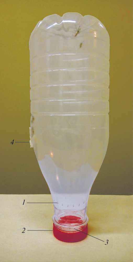 Для получения имаго A. cantans и A. communis были также собраны личинки и куколки непосредственно из водоемов, образовавшихся в основном в результате таяния снежного покрова; некоторые из этих водоемов частично образовались еще осенью за счет дождей и содержали перезимовавших личинок Culiseta morsitans (Theobald) вместе с отродившимися весной личинками рода Aedes Meigen. Место сбора — Всеволожский р-н Ленинградской обл., время сбора — конец мая в 2022 г. и со второй половины апреля по май в 2023 г. Личинок и куколок собирали сачком из шифона с диаметром обруча 8 см, глубиной 17 см и размером ячей 0.2 мм. Выплодившихся имаго содержали в прозрачных пластиковых контейнерах объемом 1–1.5 л; каждый из них представлял собой перевернутую пластиковую бутылку с навинчивающейся крышкой вместо дна (рис. 1).