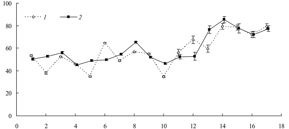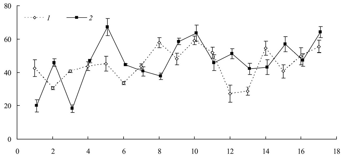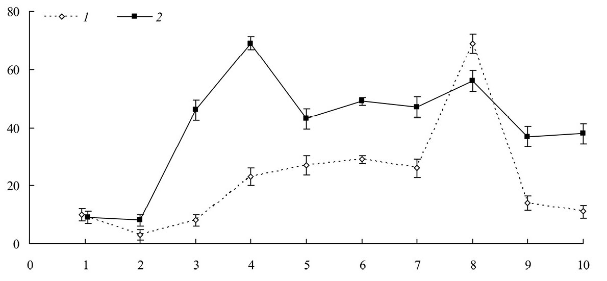 Рис. 6. Плодовитость самок из ставропольской и ВИЗР популяций Orius laevigatus (Fieber) в ряду поколений при разведении на каланхоэ. По горизонтальной оси — последовательные поколения; по вертикальной оси — плодовитость (число яиц на 1 самку, среднее и его ошибка). Популяции: 1 – ставропольская, 2 – ВИЗР.