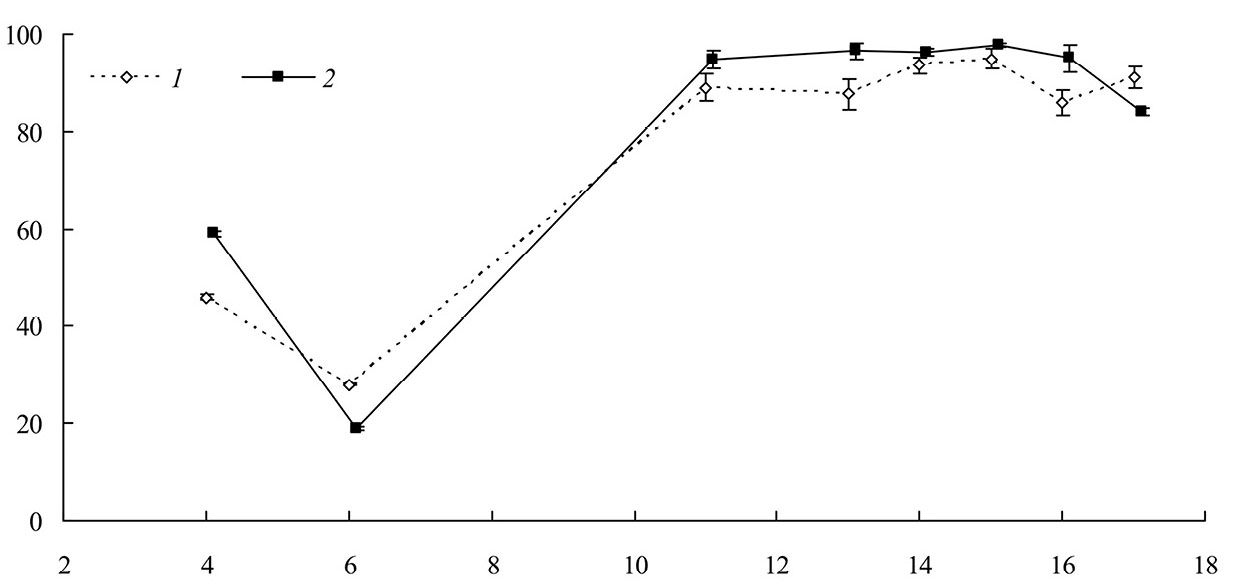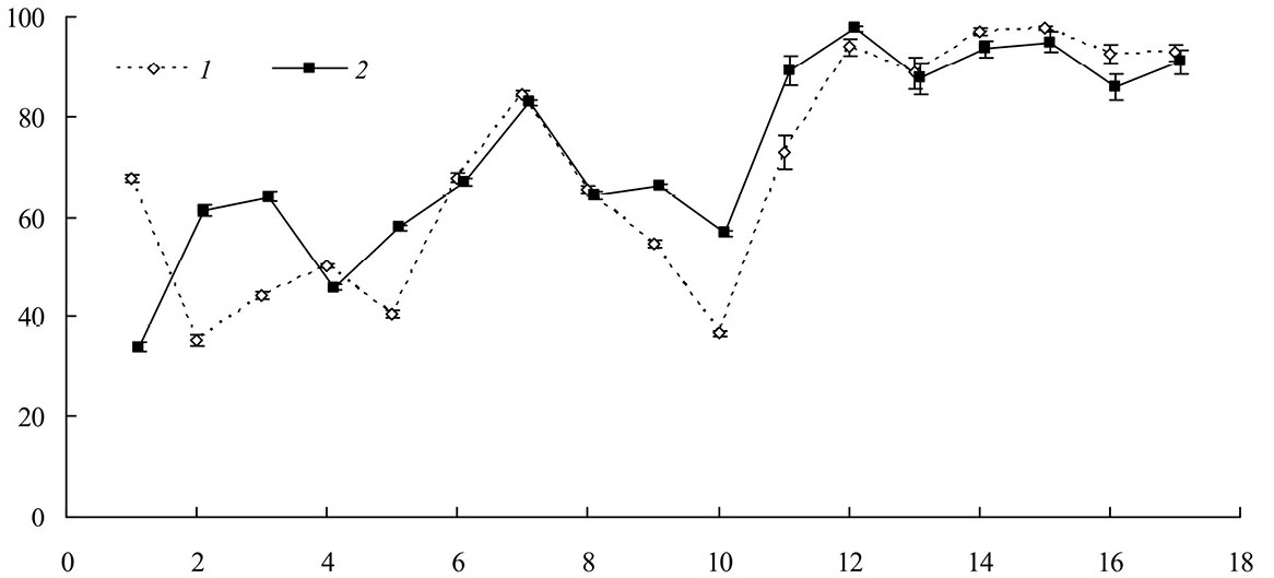 Рис. 8. Доля личинок, развившихся до стадии имаго у ставропольской и ВИЗР популяций Orius laevigatus (Fieber) в ряду поколений при разведении на каланхоэ. По горизонтальной оси — последовательные поколения; по вертикальной оси — доля личинок, развившихся до стадии имаго (%, среднее и его ошибка). Обозначения как на рис. 6, 7.