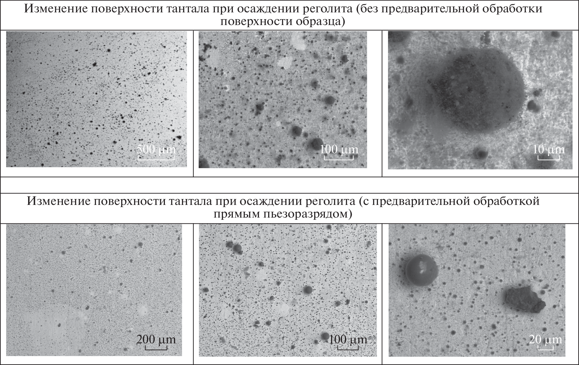 Experimental results are presented on deposition of charged particles that imitate the levitating dust of regolith (dusty plasma) on the Moon on metal plates. The experiment was based on the analogy between the physical–chemical properties of the processes that develop in regolith during microwave discharge excited by the radiation of a powerful gyrotron in the powder of regolith (lunar dust) and the processes that occur on the Moon during the bombardment of its surface by micrometeorites. The action is studied of the levitating dust cloud on plates made from molybdenum and tantalum with a size of 10 × 40 mm. The results are compared with the experiment on deposition of lunar dust on plates from stainless steel. It is shown that dust particles in the shape of spheroids of different sizes are deposited on the plates. The size distribution of these particles and their chemical composition are those of lunar regolith. It is found that the uniformity of dust deposition can be controlled by preliminary processing of the metal plates by the low-temperature plasma of a direct piezodischarge. It is shown that the levitating dust obtained under laboratory conditions (ensembles of charged regolith particles) can be used in imitation experiments on surface modification of different materials and in the development of methods for cleaning the space equipment during Moon missions.