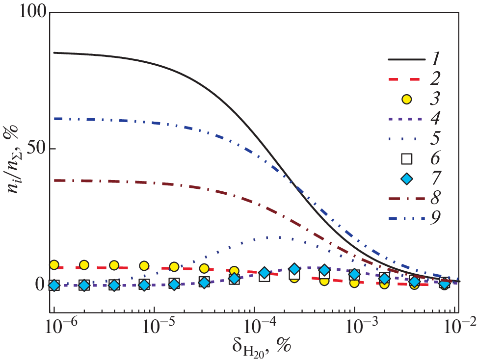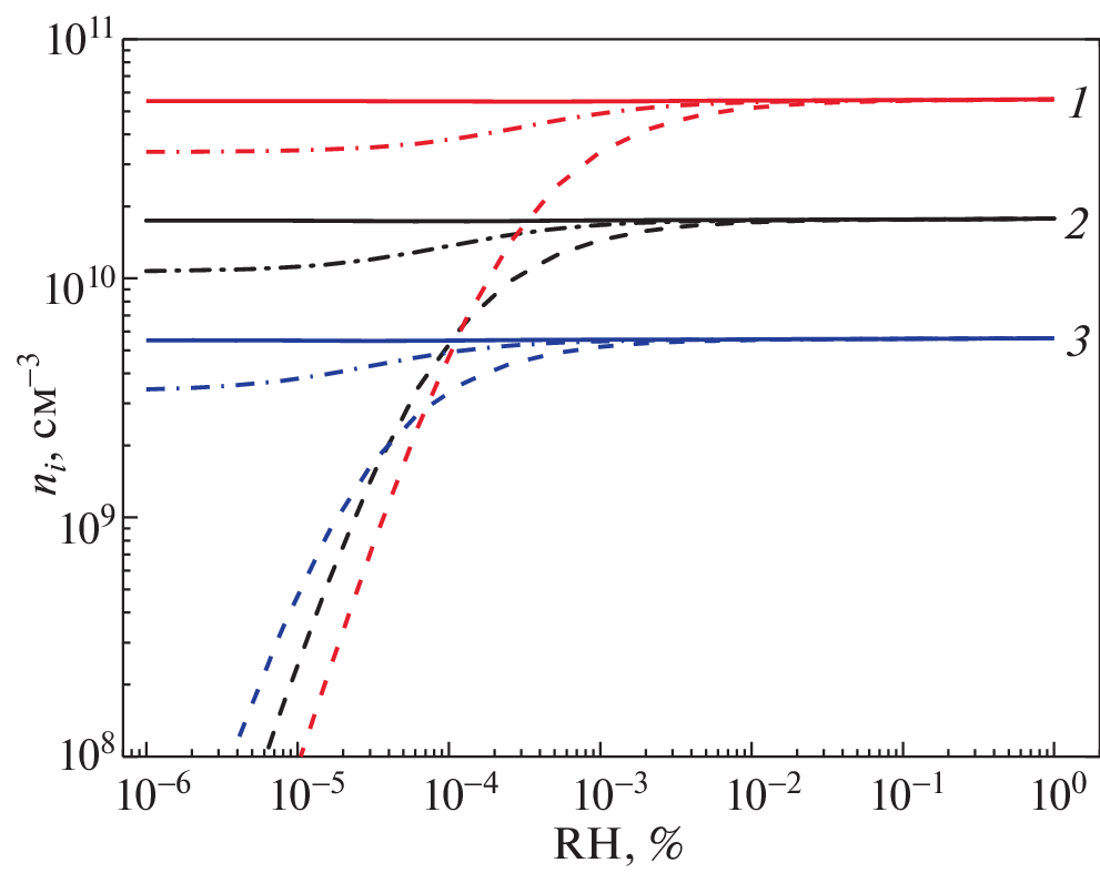 Представлены результаты экспериментальных исследований по измерению скорости коррозии железа в низкотемпературной плазме влажного воздуха, формируемой под действием пучка быстрых электронов, в зависимости от величины относительной влажности воздуха. Показано, что поток быстрых электронов, который является идеальным имитатором действия радиоактивного β-излучения, значительно интенсифицирует коррозию железа в плазмообразующей газовой среде, в которой одновременно присутствуют кислород и пары воды. Установлено, что скорость коррозии в условиях радиоактивного облучения резко возрастает, когда относительная влажность воздуха превышает 10%. Проведено численное моделирование ионного состава плазмы с учетом 12 положительных и 12 отрицательных гидратированных ионов при разных интенсивностях источника внешней ионизации и при разных значениях относительной влажности от 10–6 до 100%. На основе проведенных оценок выдвинута гипотеза об определяющей роли кластерных гидратированных ионов, обильно образующихся в плазме влажного воздуха при атмосферном давлении, в гетерогенных процессах окисления железа.