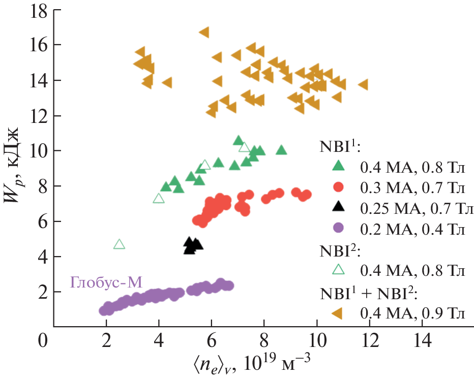 field up to 0.9 T and a plasma current of 0.3–0.4 MA in a mode with auxiliary heating by two atomic injectors