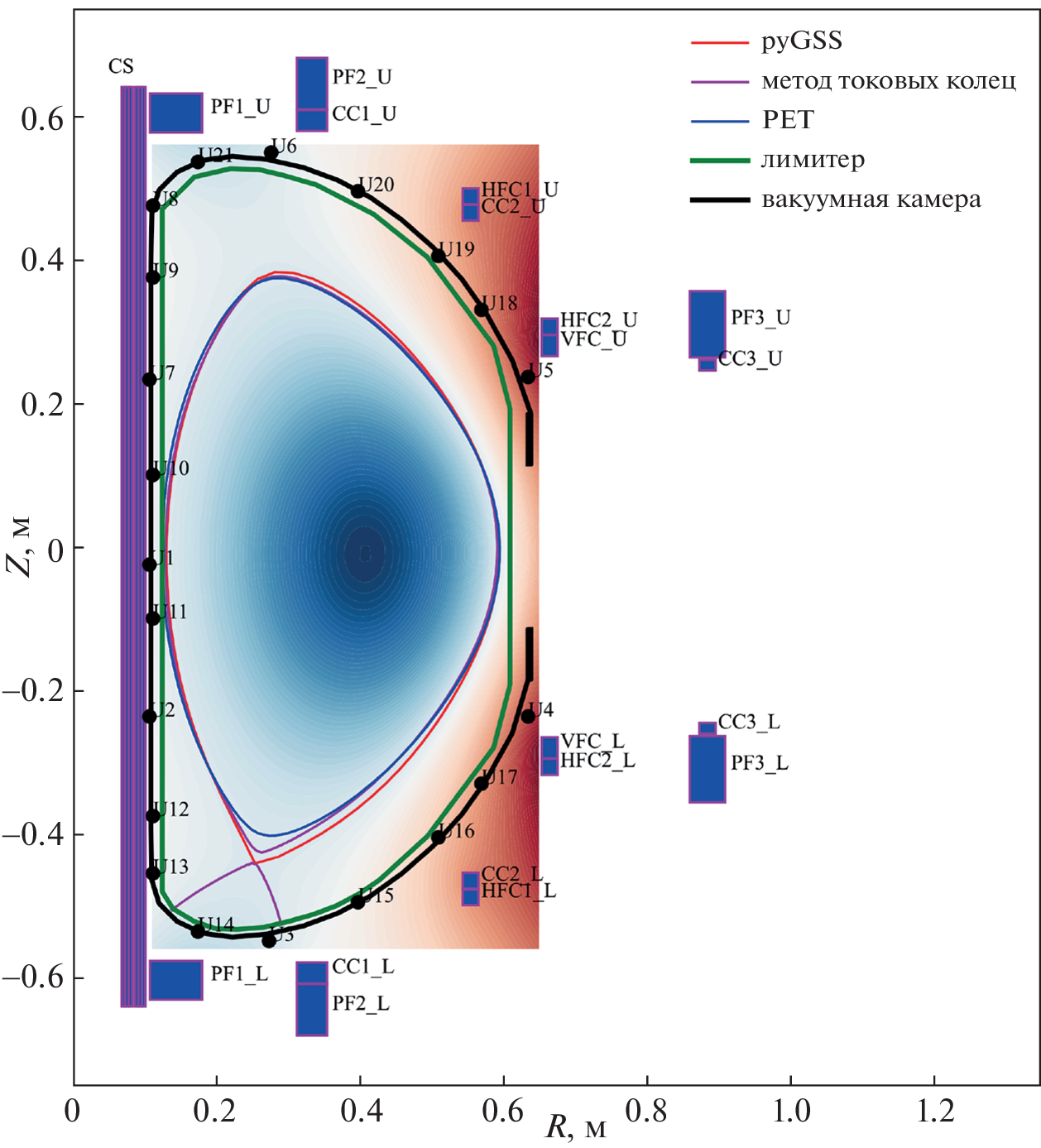 plasma current, positions of the limiter and current-conducting wall, etc., are used as the input parameters.