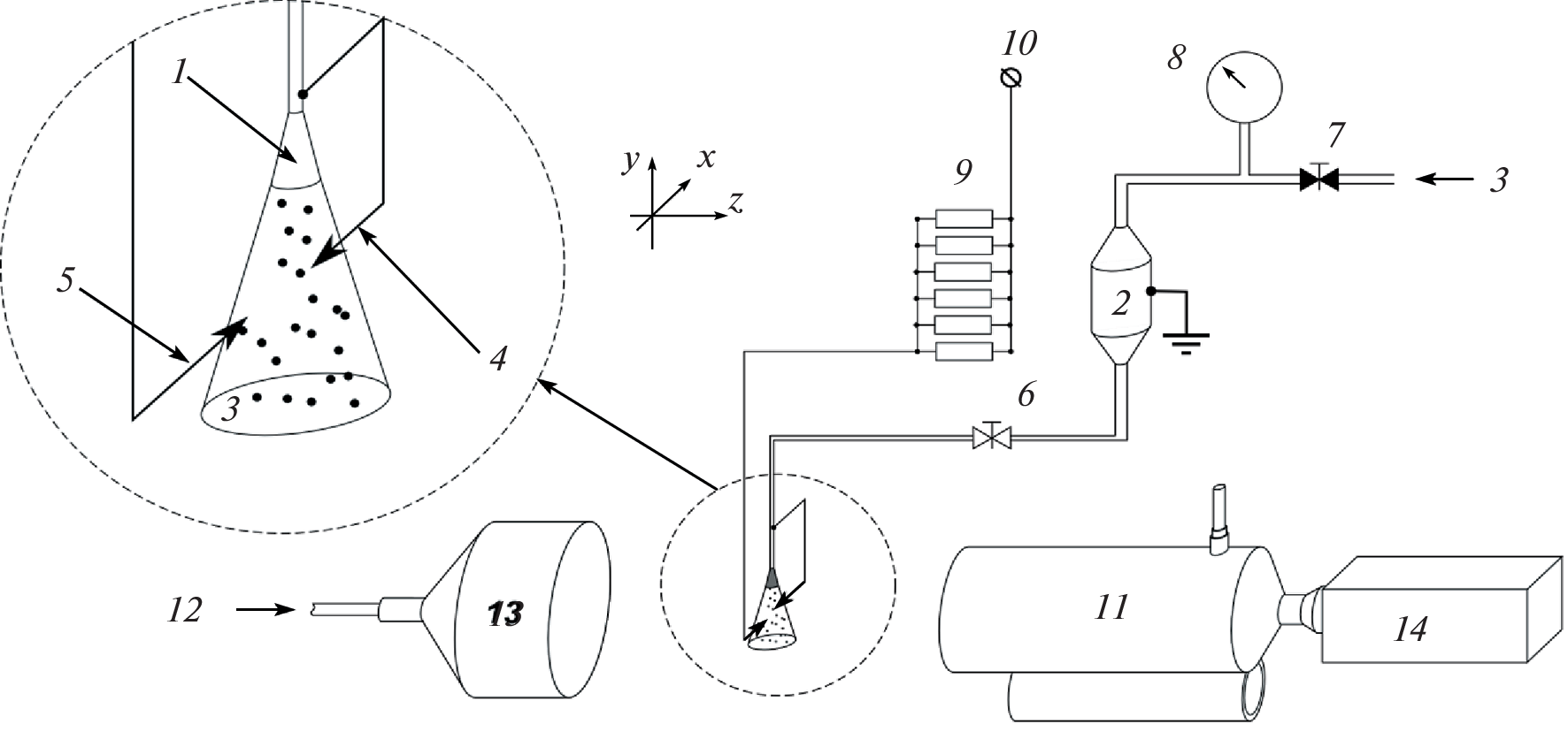 The joint impact of an electrical discharge and a gas–droplet flow of a conducting liquid created by a centrifugal nozzle is studied. In the experiment, the electrical parameters of the discharge are recorded, and the local characteristics of the spray, namely, the droplet diameter distributions of the number of droplets and the components of their velocity vector are measured. The measurements are carried out using double shadow microphotography. The effect of a spray of a conducting liquid on the time-averaged electrical parameters of the discharge, as well as changes in the properties of the spray under the influence of high voltage and current, are studied. Additionally, the spray characteristics are measured when a high voltage of pre-breakdown value is applied. High-speed photography of a discharge in the presence of droplets of conducting liquid is carried out.