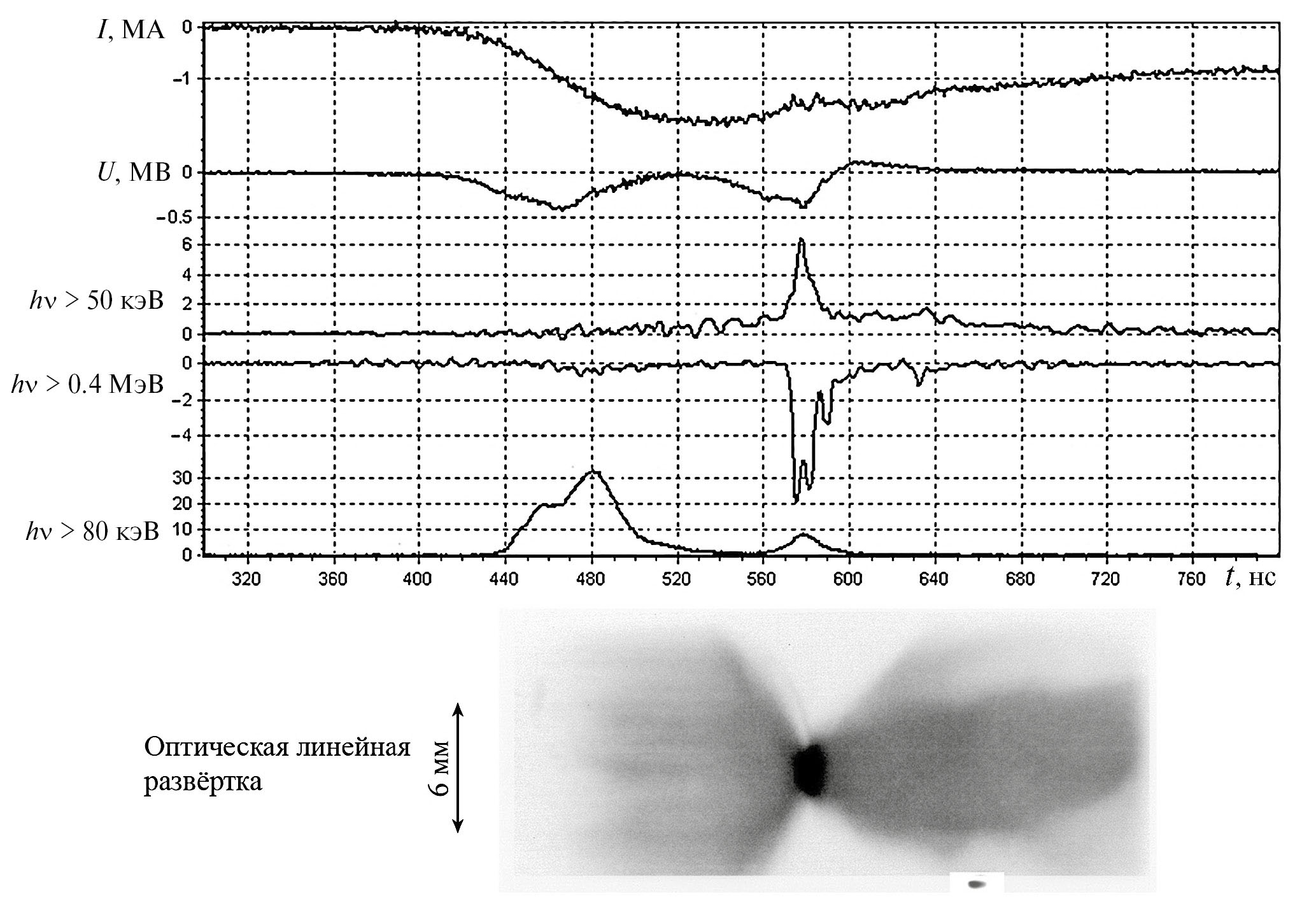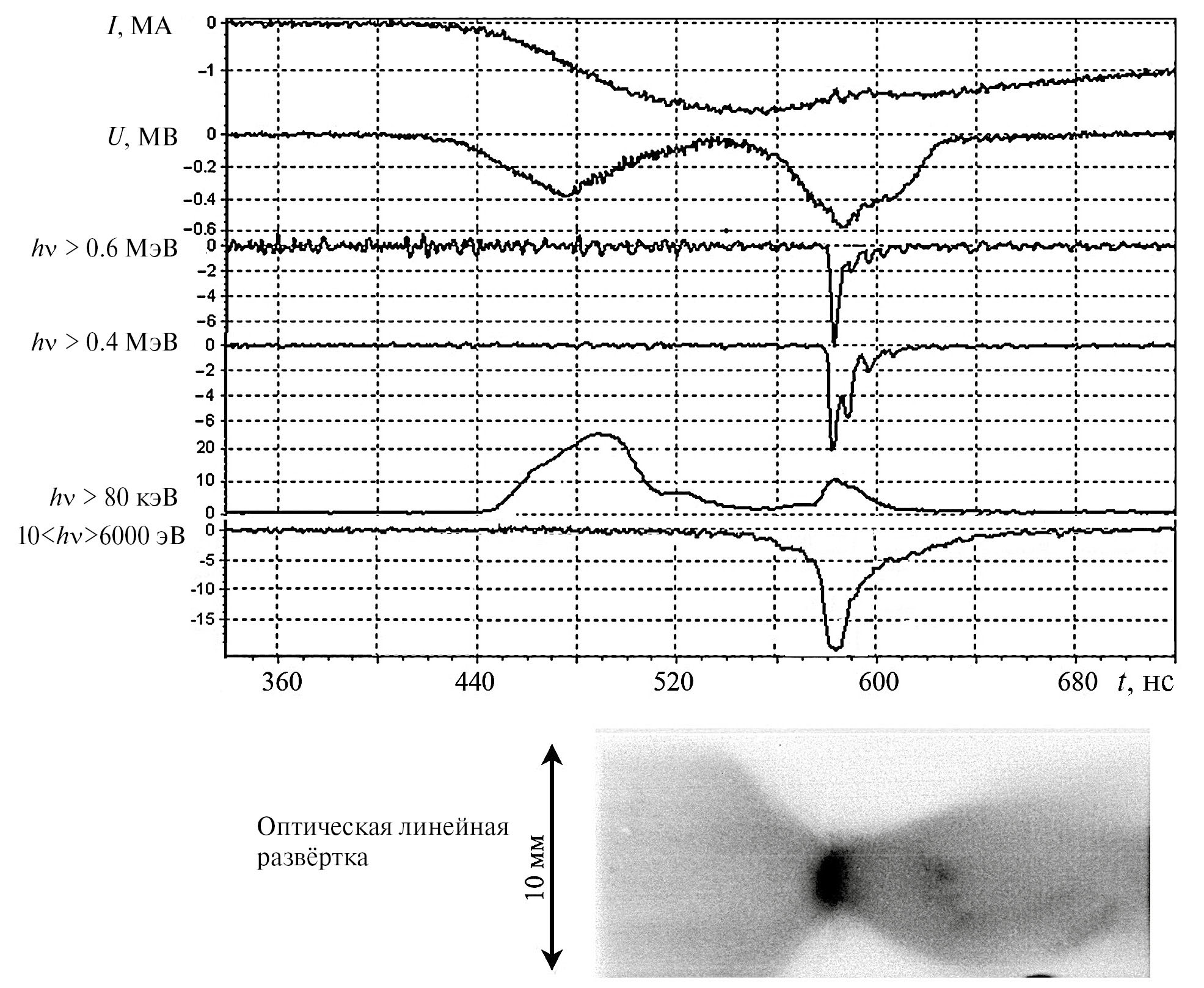 На установке NTF (Невада, США) с током 1,2 МА в экспериментах с нагрузкой X-пинч зарегистрировано два типа сверхжёсткого рентгеновского (СЖР) излучения с полной длительностью 100–150 нс и с энергией квантов, превосходящей заряд электрона, умноженный на напряжение высоковольтного диода [10]. В работе [11] также в экспериментах с Х-пинчом при токах до 500 кА наблюдались ускоренные электроны с двумя характерными временами: “короткоживущие” 1–2 нс и “долгоживущие” 5–10 нс, — при энергии электронов 10–30 кэВ и 100–200 кэВ, соответственно. Та же группа экспериментаторов опубликовала данные по регистрации коротких импульсов жёсткого рентгеновского (ЖР) излучения на измененной конструкции Х-пинча (“гибридный пинч”) [12]. Длительность импульса ЖР-излучения составила 2–3 нс при энергии квантов выше 60 кэВ.