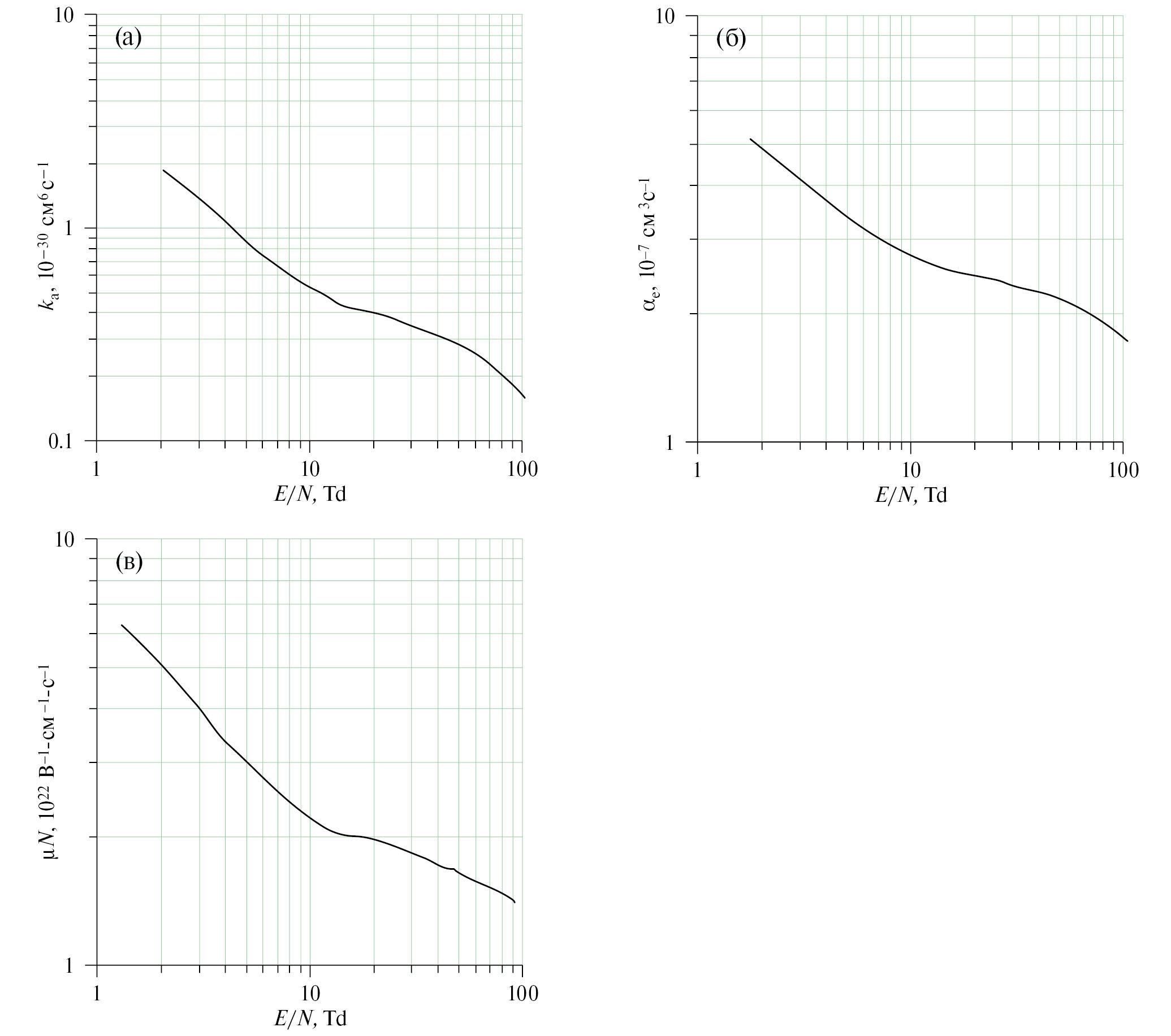Константа прилипания ka, коэффициент рекомбинации αe и величина μN являются функциями параметра E/N. Зависимости ka(E/N) αe(E/N) и μN(E/N), которые мы использовали в наших расчетах, получены на основании данных в работах [6–8] и приведены на рис. 1.