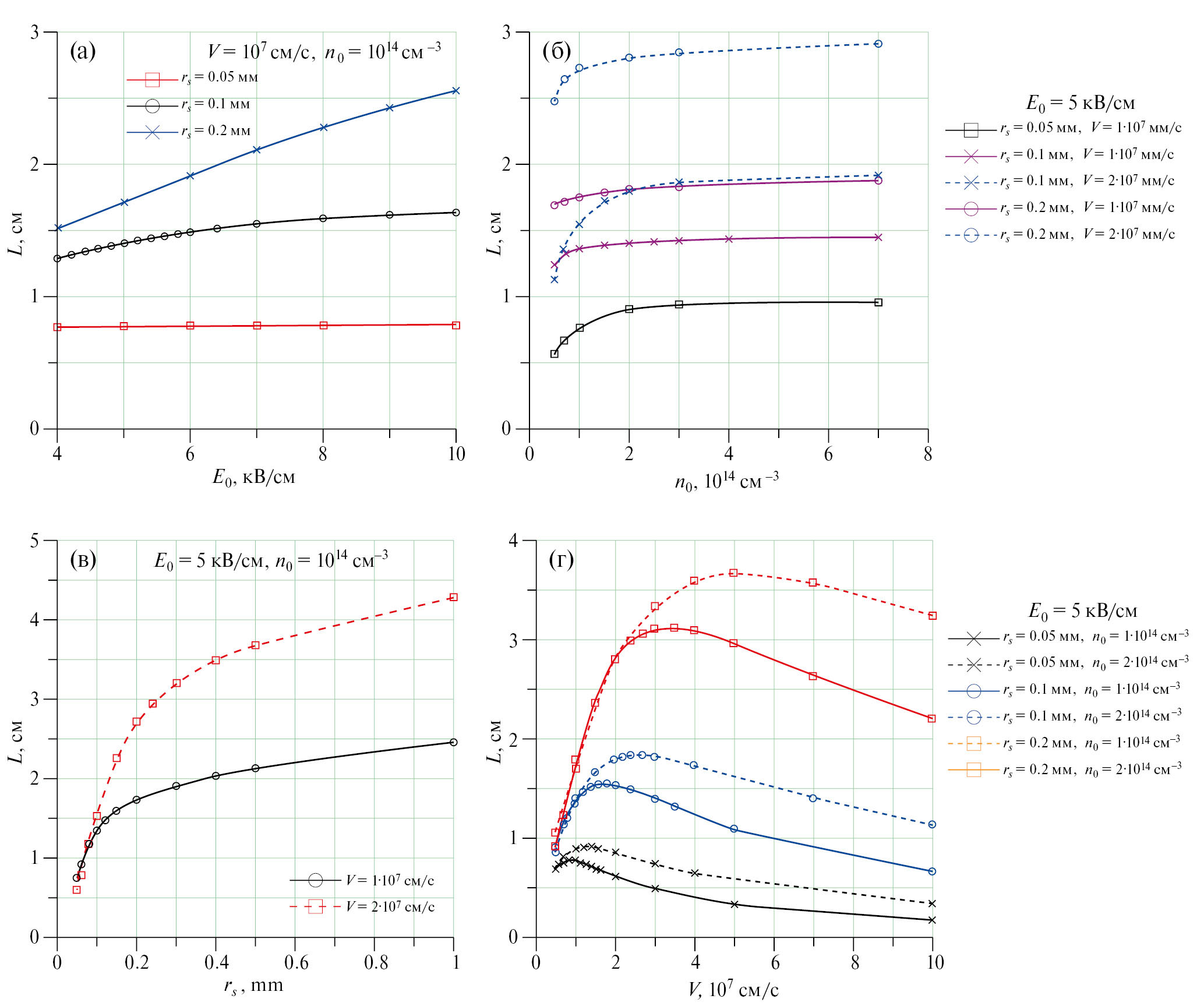 Результаты анализа зависимости эквипотенциальной длины L положительного критического стримера от его параметров (радиуса rs, скорости V и концентрации электронов в головке стримера n0, а также напряженности внешнего поля E0) позволяют предположить справедливость следующего условия для положительного критического стримера: