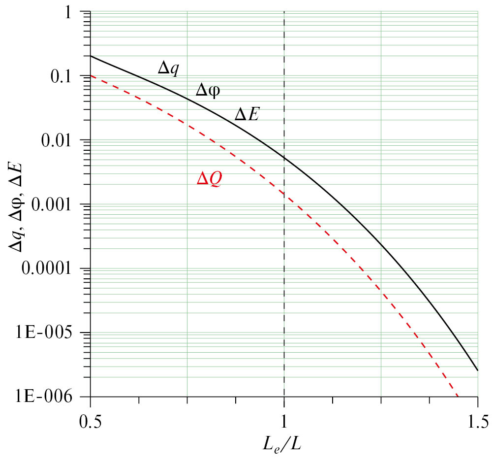 Рис. 7. Относительные изменения параметров критического положительного стримера при контакте хвоста стримера с электродом на расстоянии Le от головки стримера в зависимости от отношения расстояния Le к эквипотенциальной длине стримера L