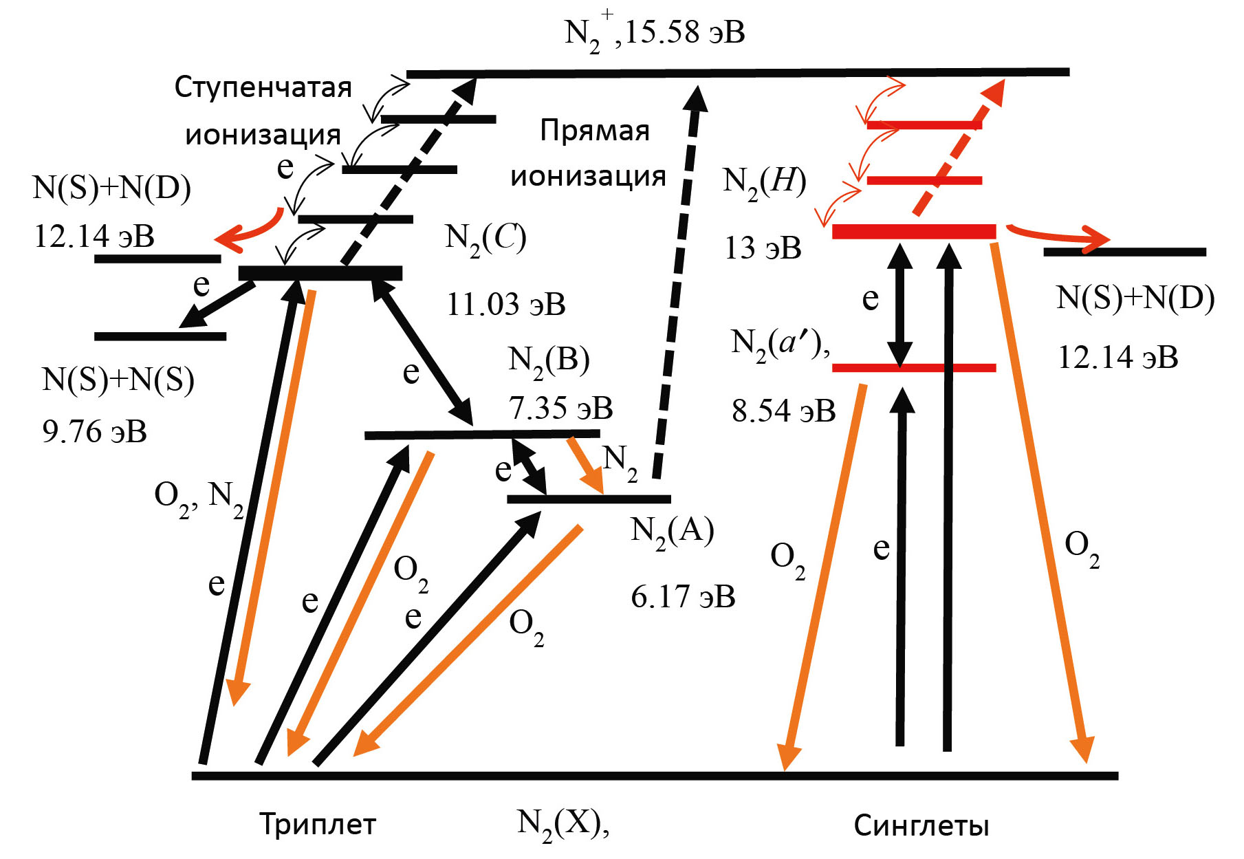Модель работы [15] была доработана в плане более точного описания кинетики возбужденных состояний молекулы азота раздельным учетом переходов по триплетным и синглетным термам и более корректным описанием процессов возбуждения этих термов электронным ударом путем учета процесса диффузии электронов при определении набора энергии электроном в электрическом поле.