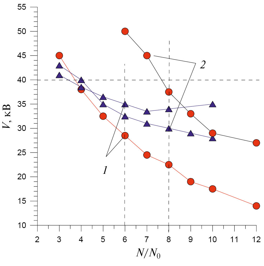 На рис. 4 представлены результаты экспериментального исследования [13] стример-филаментарного перехода в воздухе и азоте в виде кривых в плоскости давление N/N0 и амплитуда импульса напряжения V. Эти кривые разделяют области, где разряд развивается в привычном квазиоднородном режиме (точки ниже кривой) и где он принимает филаментарную форму (точки выше кривой).