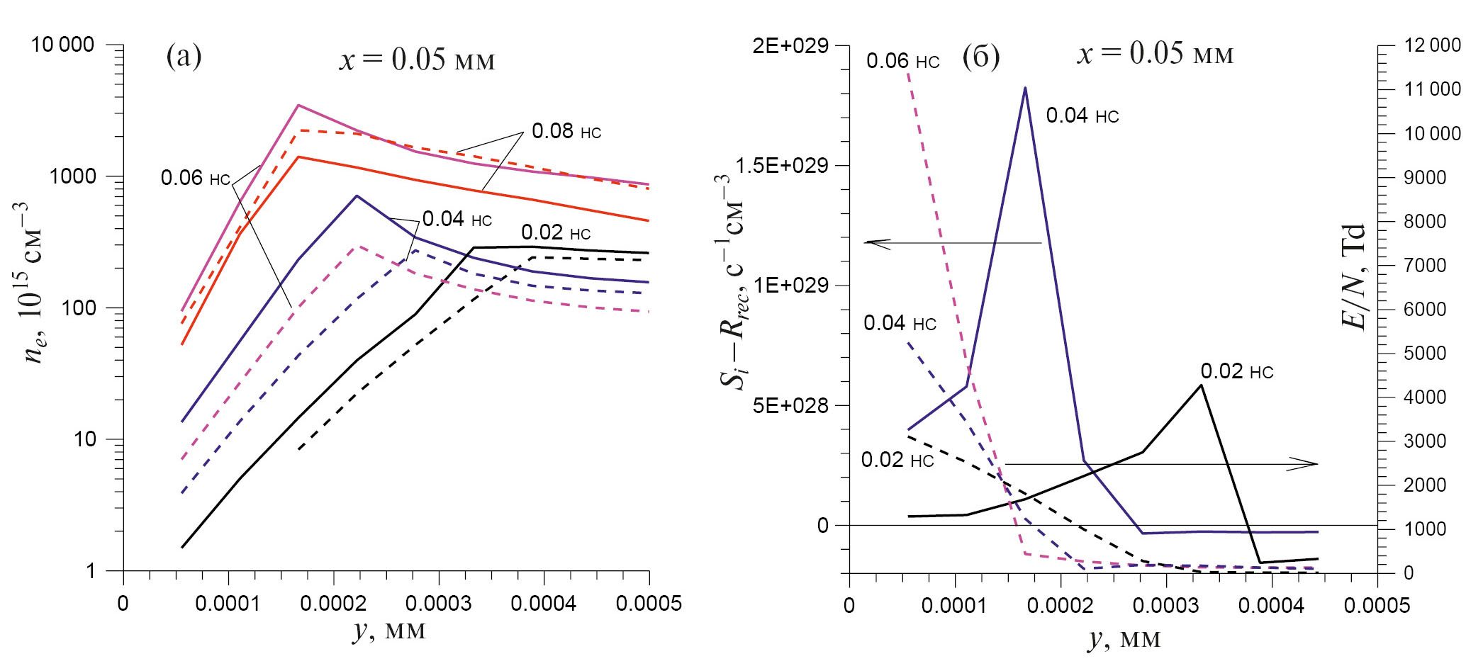 Как и в случае положительной полярности импульса напряжения, причиной развития слоя с нарастающей ne является ионизация из С- и Н-состояний N2. На рис. 7б показана эволюция профилей E/N и разности суммарных источников ионизации Si и рекомбинационных стоков Rrec в азоте в сечении разряда х = 0.05 мм.