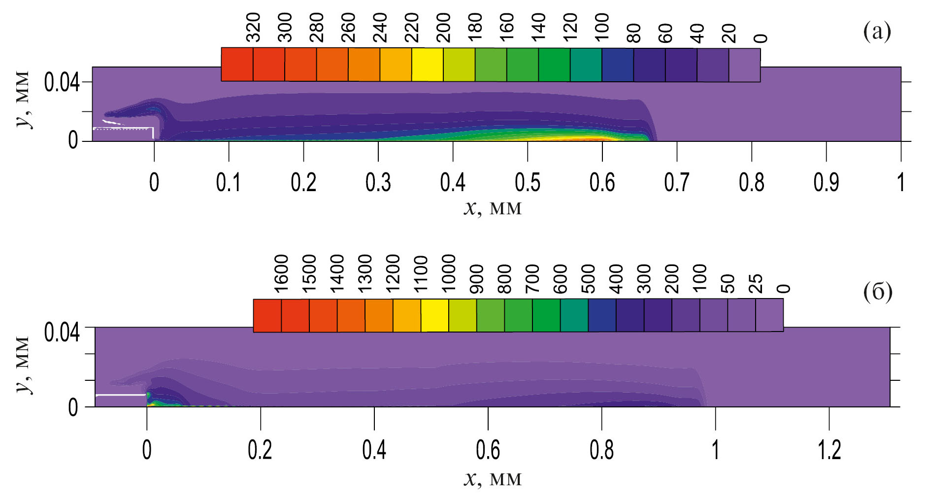 Причиной, по-видимому, является грубость используемого приближения локального поля в областях с резкими градиентами концентрации электронов и электрического поля. Более корректный результат можно получить только при учете пространственного переноса энергии электронов с расчетом констант неупругих процессов не как функций локального поля, а как функций локальной энергии электронов, что и предполагается сделать в следующей работе.