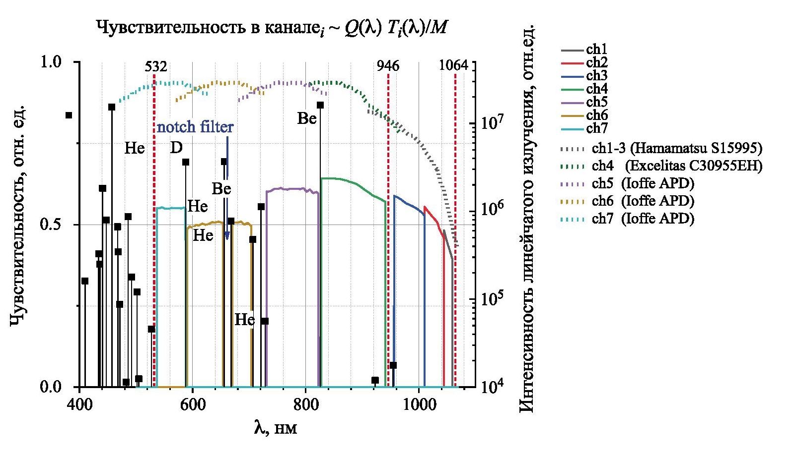 Выбранная конфигурация позволяет отстроиться от наиболее интенсивных спектральных линий фонового излучения плазмы [17] и работать одновременно с тремя зондирующими Nd: YAG-лазерами с длинами волн 1064, 946, 532 нм. При анализе точности измерений, оценка фонового сигнала делалась на основании работы [18] в предположении, что он обусловлен преимущественно тормозным излучением, собираемым вдоль хорды наблюдения. Для оценки уровня фонового излучения использовались радиальные профили основных параметров шнура для разряда ТРТ в D/D-плазме для режима B0 = 8 T, Ip = 5 MA, ⟨ne⟩ = 1020 м−3, (см. рис. 11 в [19]). Для учета других возможных вкладов в фоновый сигнал, вызванных отражением излучения плазмы от внутренней стенки реактора, неопределенностью профиля эффективного заряда плазмы и линейчатым излучением, рассчитанное среднее значение интенсивности тормозного излучения вдоль хорды наблюдения было увеличено в пять раз. Распределение чувствительности по спектральным каналам представлено на рис. 3.