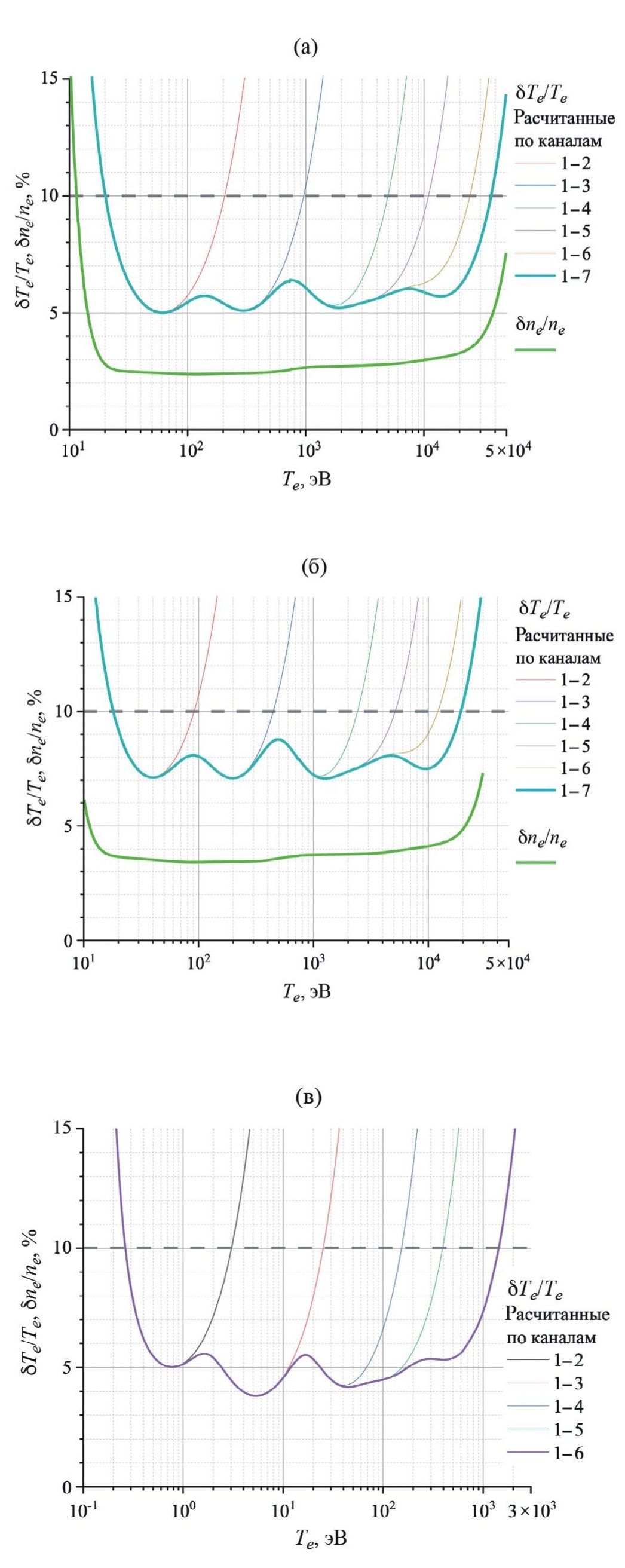 Рис. 5. Ожидаемая погрешность измерения Te и ne для: (а) центральной (EL = 2.4 Дж, ne = 1∙1019 м−3); (б) краевой (EL = 4.8 Дж, ne = 0,5∙1019 м−3); (в) диверторной плазмы (EL = 1.5 Дж, ne = 1∙1019 м−3).
