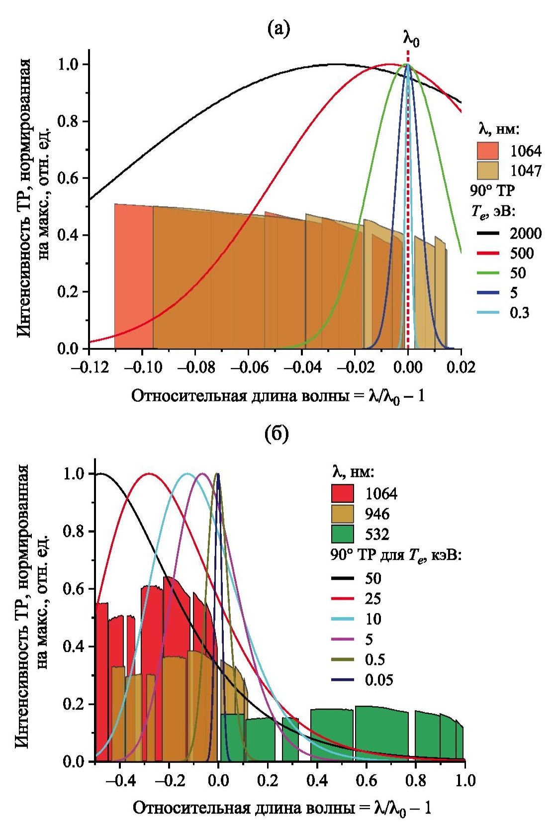 Рис. 7. Характеристики спектральных каналов полихроматора системы ТР и контуры линии томсоновского рассеяния. Относительная чувствительность спектральных каналов на разных лазерных длинах волн показано прямоугольниками разной высоты. При расчете чувствительности делалась нормировка на одинаковую энергию лазеров, учитывая уменьшение количества более коротковолновых фотонов на единицу лазерной энергии: (а) относительное расположение набора спектральных каналов и томсоновских контуров линий на длинах волн 1064, 1047 нм для электронных температур 0,3, 5, 50, 500 и 2000 эВ; (б) относительное расположение набора спектральных каналов и томсоновских контуров линий на длинах волн 1064, 946 и 532 нм для электронных температур 0.05, 5, 10, 25 и 50 кэВ.